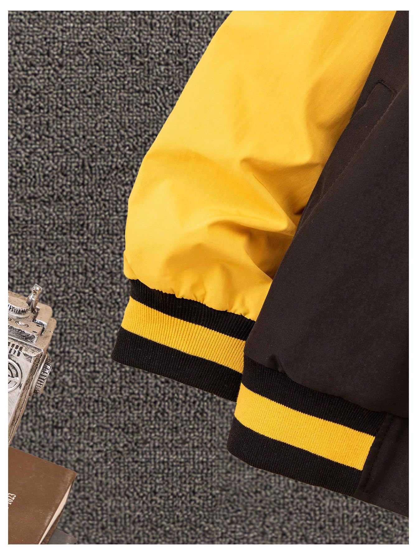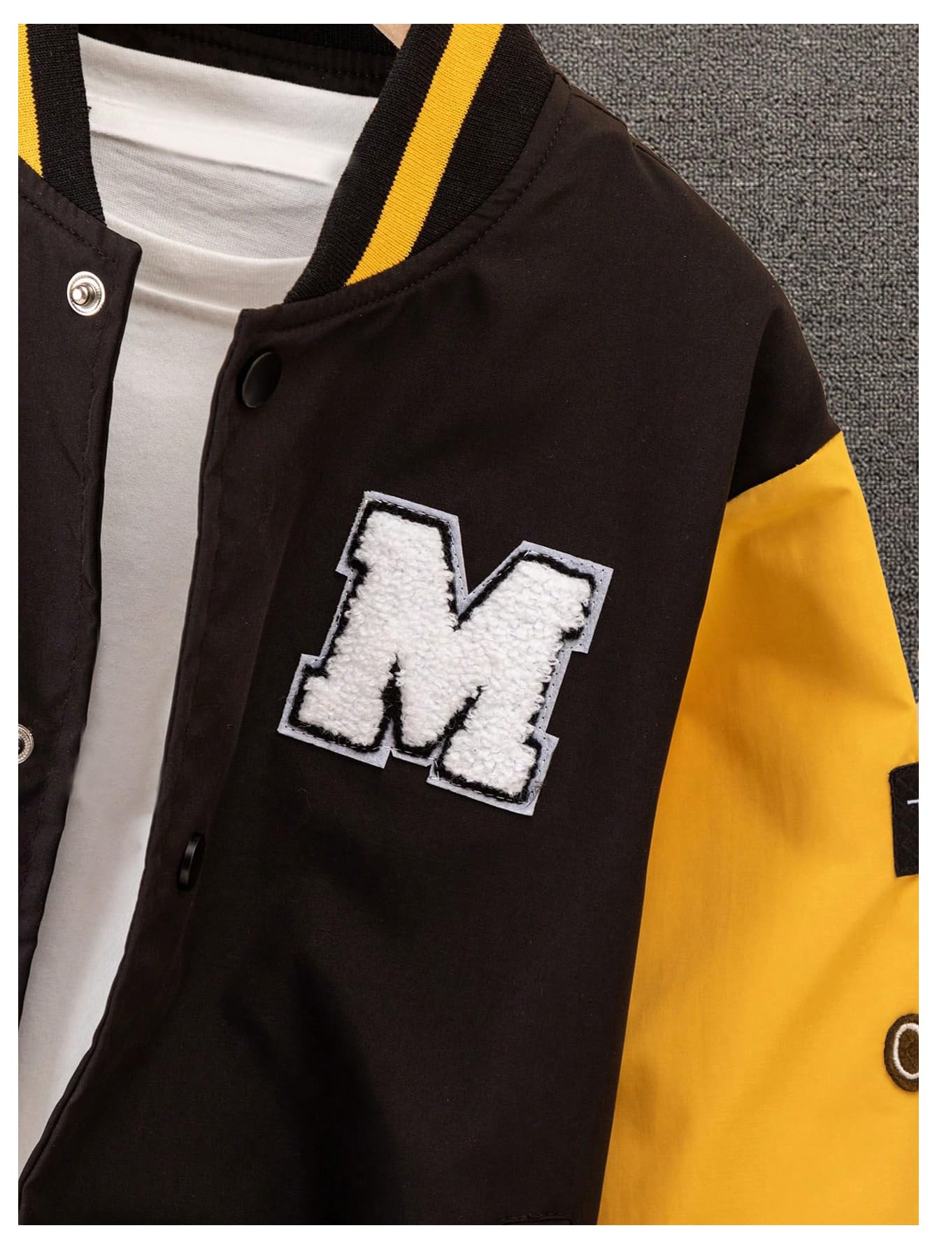 Features: baseball jacket, cartoon and letter prints, long sleeve, snap button, varsity style, causal outerwear