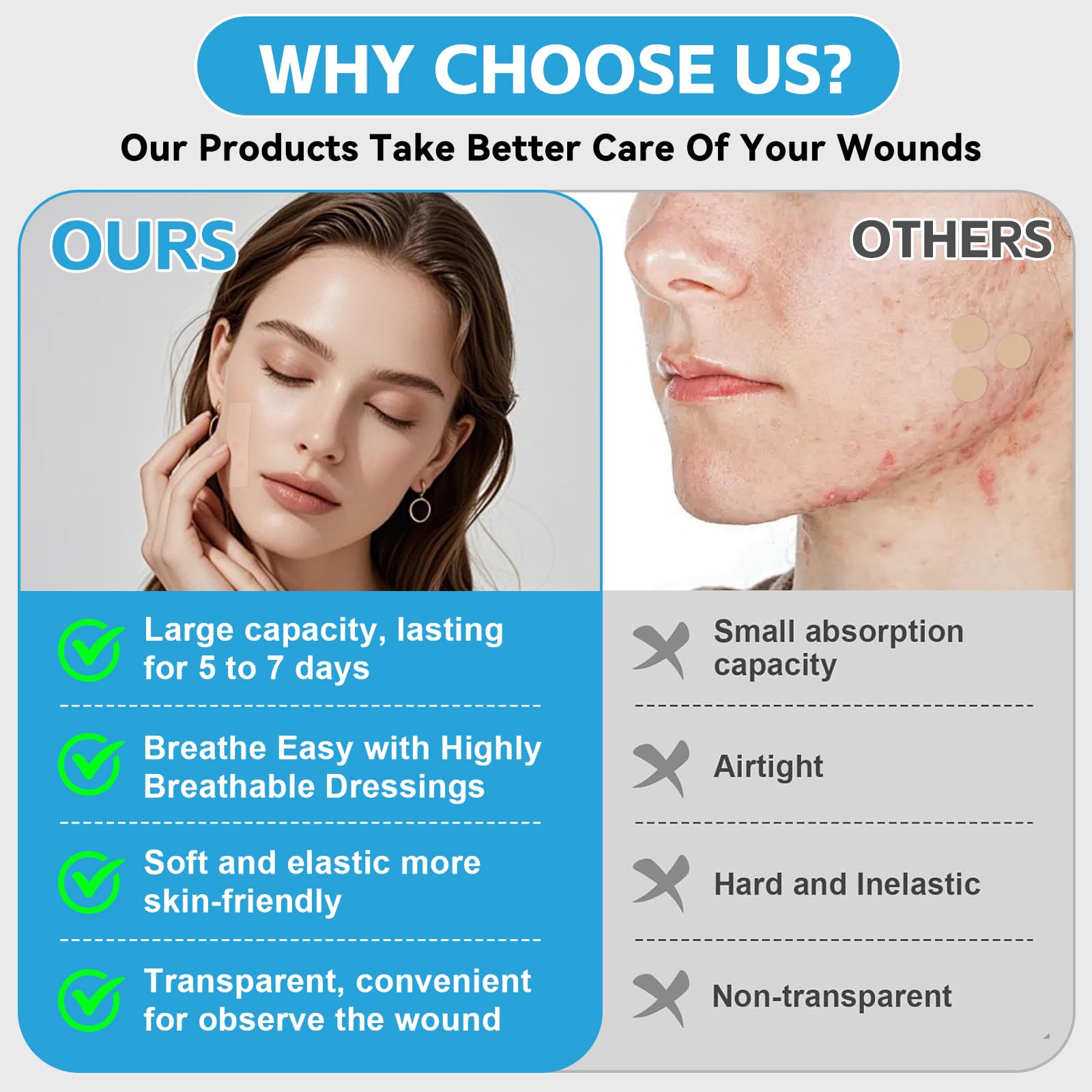Secure Adhesion - Flexible design conforms to body contours including face, elbows and knees, Semi-transparent for better visibility of the wound