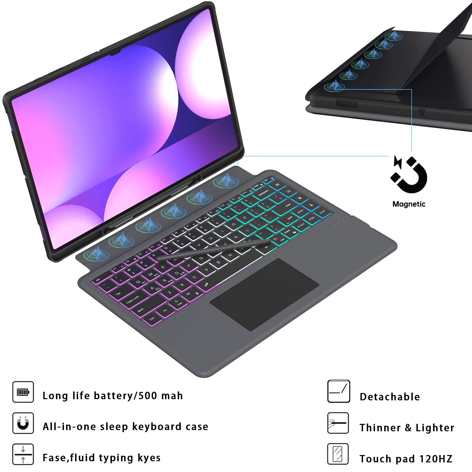 Backlit Keyboard Tab S9 ultra 2023/S10 ultra 2024 - tab S9 ultra tablet case with keyboard provides 7 color backlit options & 3 brightness modes, It has 3 brightness modes adjustments for more comfort. The spacious layout of the backlit keyboard is convenient for typing, and it is full of science and technology. You can read, browse and work freely anytime, anywhere. When working late, simply switch to one of the 7 back-light colors to illuminate the keyboard.