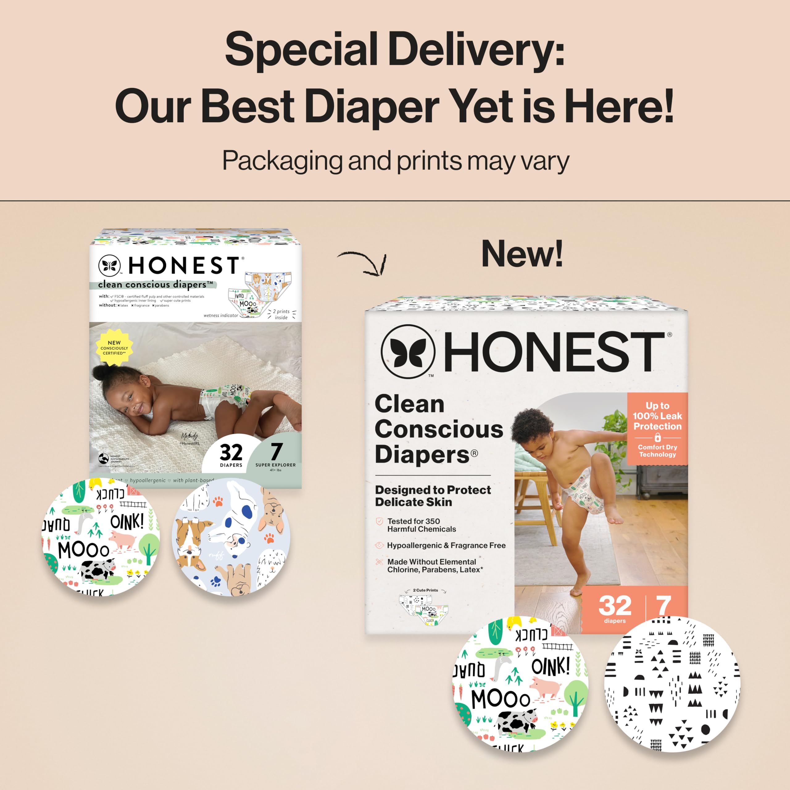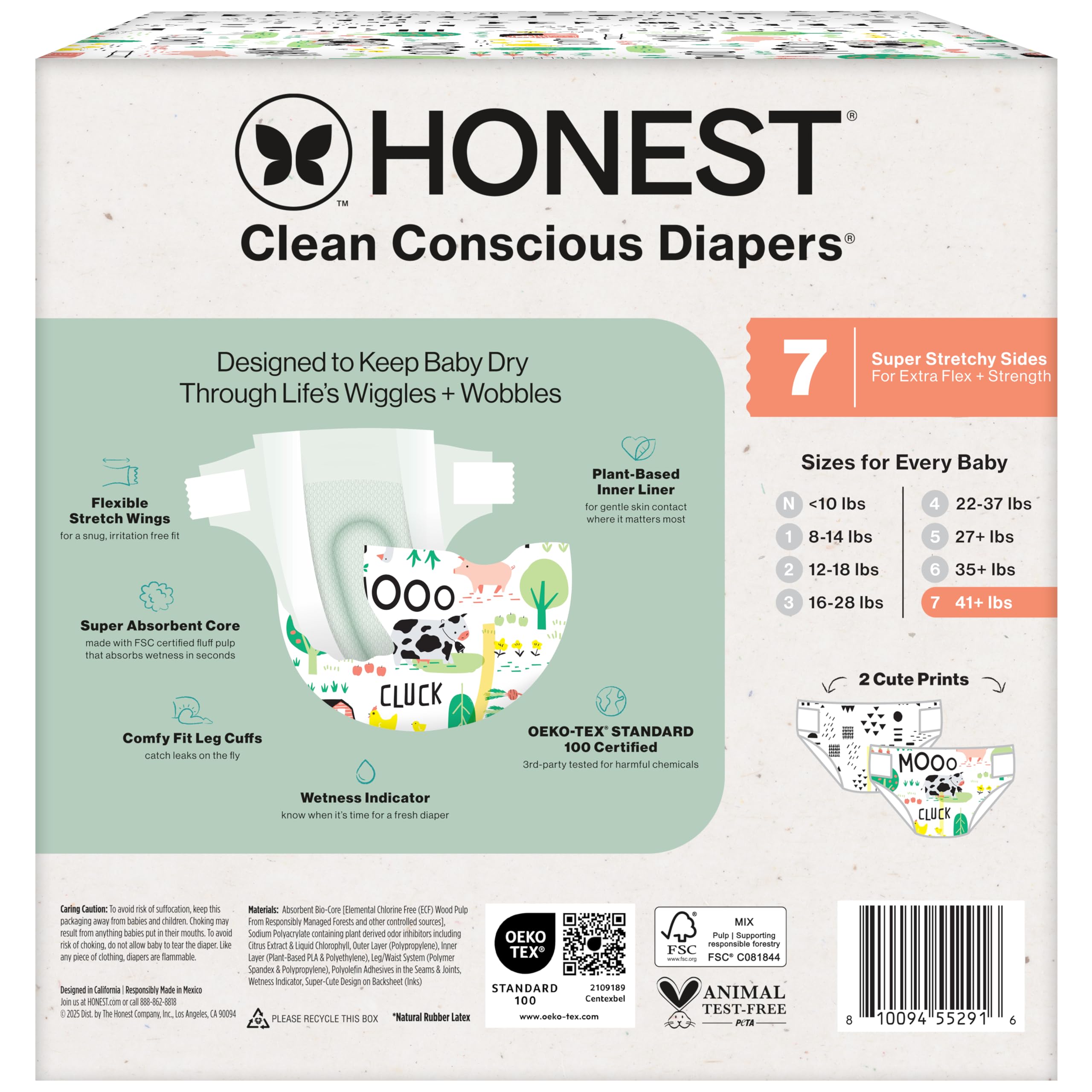 Designed to protect delicate skin, Honest Clean Conscious Diapers keep baby comfortable and dry through all the wiggles and wobbles! Our softest diaper yet delivers up to 100% leak protection with Comfort Dry Technology. The hypoallergenic, plant based inner liner, flexible stretch wings, super absorbent core, and channel technology provide a comfy, secure fit for all ages and stages. Because safety is top priority, these diapers are OEKO-TEX STANDARD 100 Certified, a 3rd party that tests for 350 harmful chemicals, and made with FSC Certified Fluff Pulp and other controlled materials. And for cuteness overload, each diaper features a super cute print!