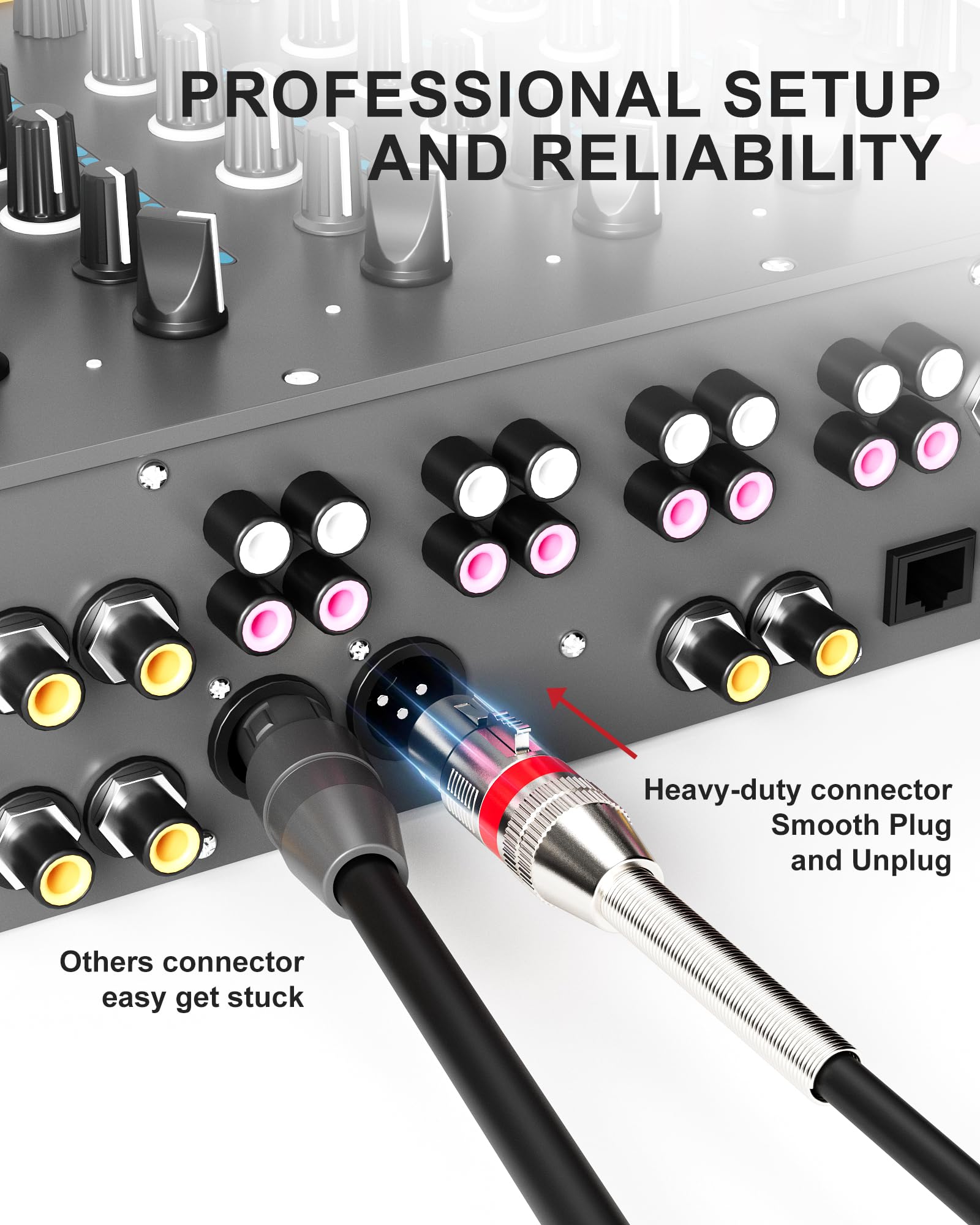 Metal Spring SR for Longevity: Foboiu XLR cables use a metal-spring stress relief that spreads bend force, prevents pull-out and jacket split at the connector, and keeps signals stable. Compared with ordinary XLR cables using PVC/rubber boots that kink and crack at the plug, ours maintains a gentle radius for fewer failures under frequent coiling, uncoiling, and stage use.