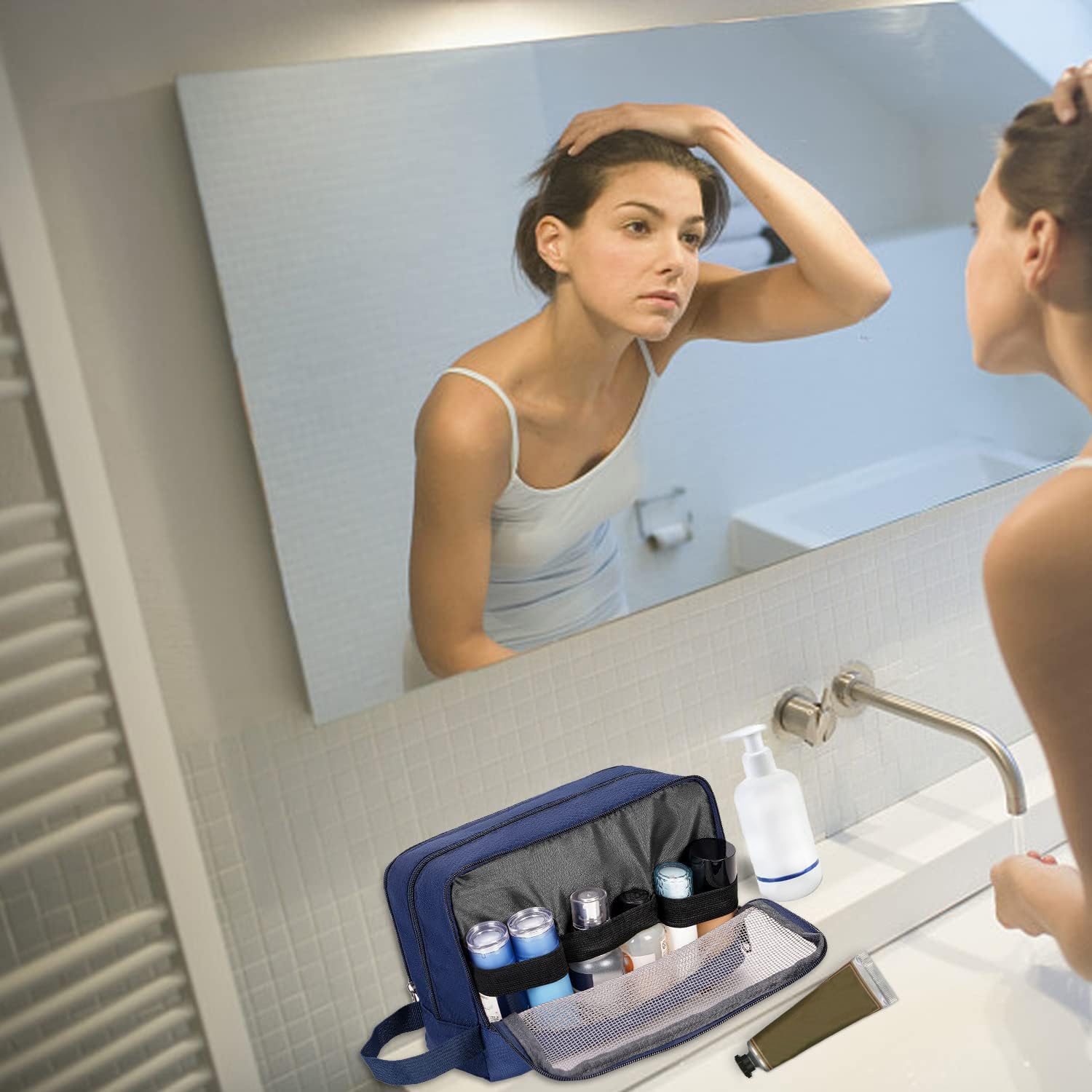 【ORGANIZED COMPARTMENTS】 --- Main compartment that holds larger items such as shampoo bottles or shaving cream. One zippered mesh pouch that keeps your smaller toiletries and cosmetics in a place visible and breathable. Other side front zipper pocket that provides extra storage with easy.