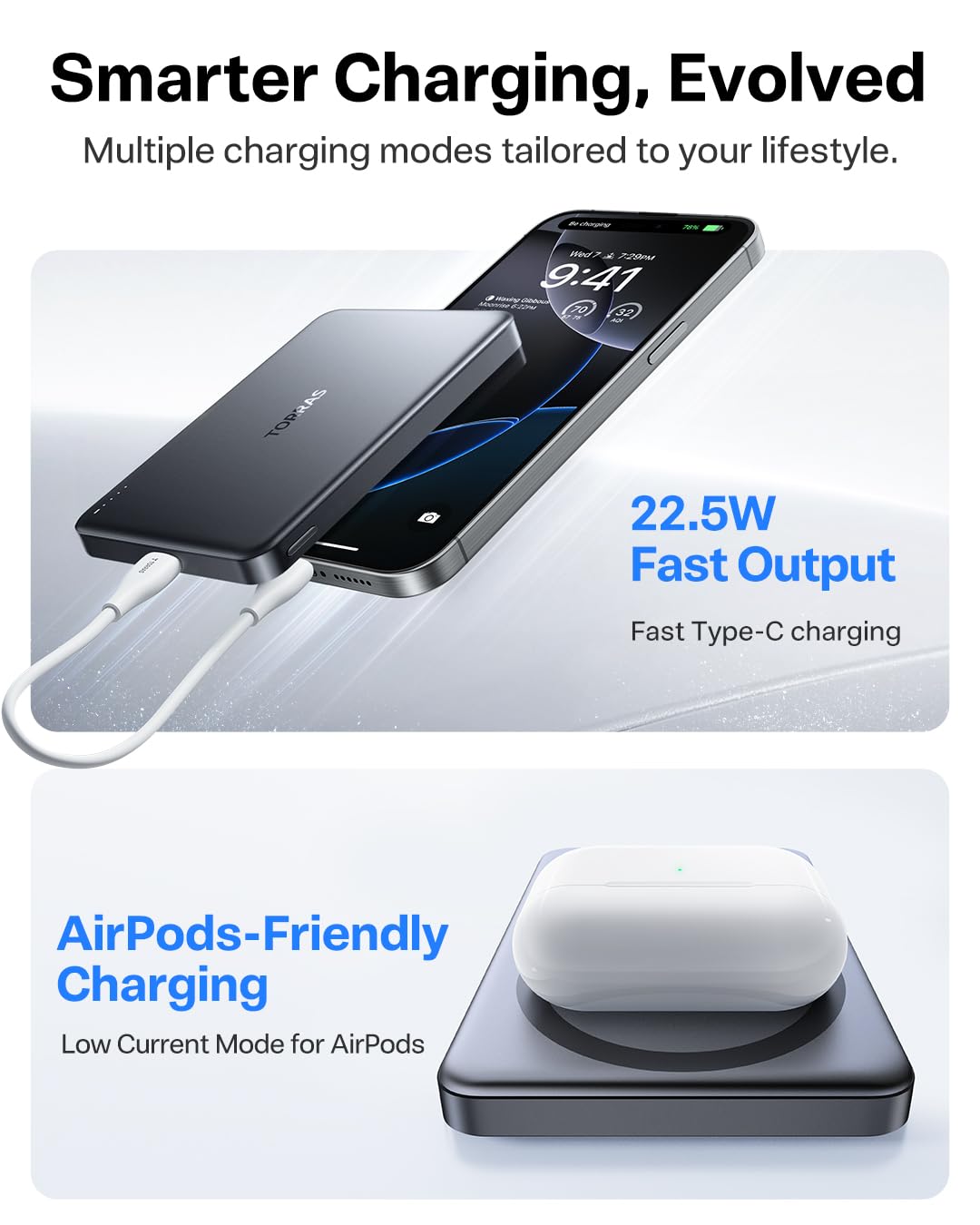 【Super Fast Charging】Tired of waiting for your power bank to charge? This power bank fast charging supports 22.5W wired fast charging and 15W wireless fast charging(7.5W wireless charging for iPhone), ensuring your devices can be charged quickly and efficiently. Whether you're on a long trip, a business trip, or away from a power source for extended periods, you never have to worry about running out of battery again.