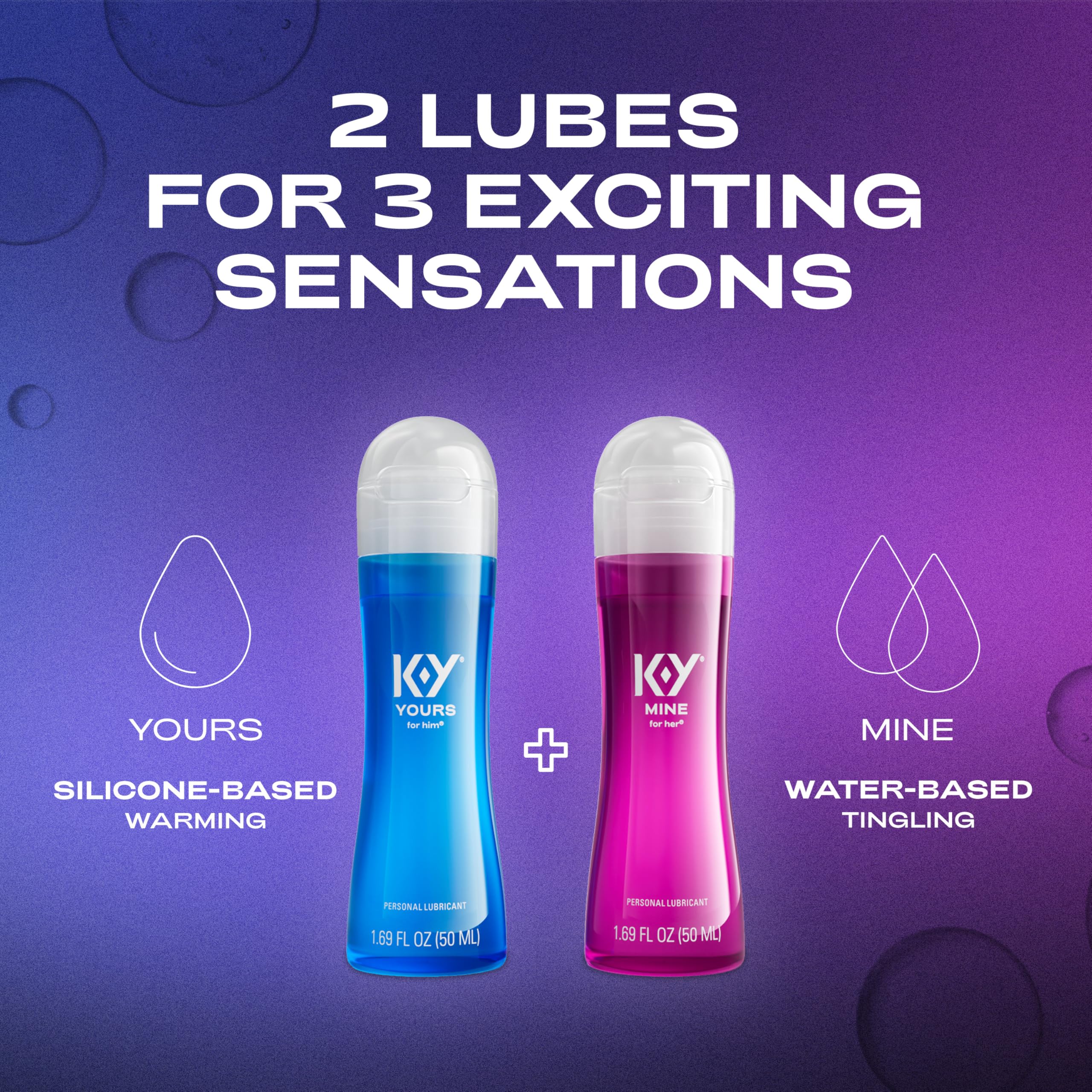 Ready to take your intimacy to thrilling new heights? Ignite the passion with K-Y Yours + Mine Couples lube: the ultimate tool to spice up the bedroom for couples. Unleash your desires and experience a sensational journey with our sensorial couples lube. "Mine" water-based lube for women provides a thrilling, tingling sensation for her. "Yours" silcone-based lube for men provides an invigorating, warming sensation for him. When combined, these exciting personal lubricants create a sizzling chemistry that will leave you both craving more. Want to add even more excitement? K-Y Mine lube for women (pink bottle) is a great couples toy lube, ensuring endless possibilities for pleasure. The new formula is made without hormones or artificial colorants. Both lubes are compatible with natural rubber latex and polyisoprene condoms (not polyurethane). Take the passion with you wherever you go! Our compact, 1.69 fl oz travel lube bottles are perfect for on-the-go excitement, so you're always prepared for adventure. Whether it's your honeymoon or a quick weekend getaway, K-Y lubricants are the travel accessories you don't want to forget.