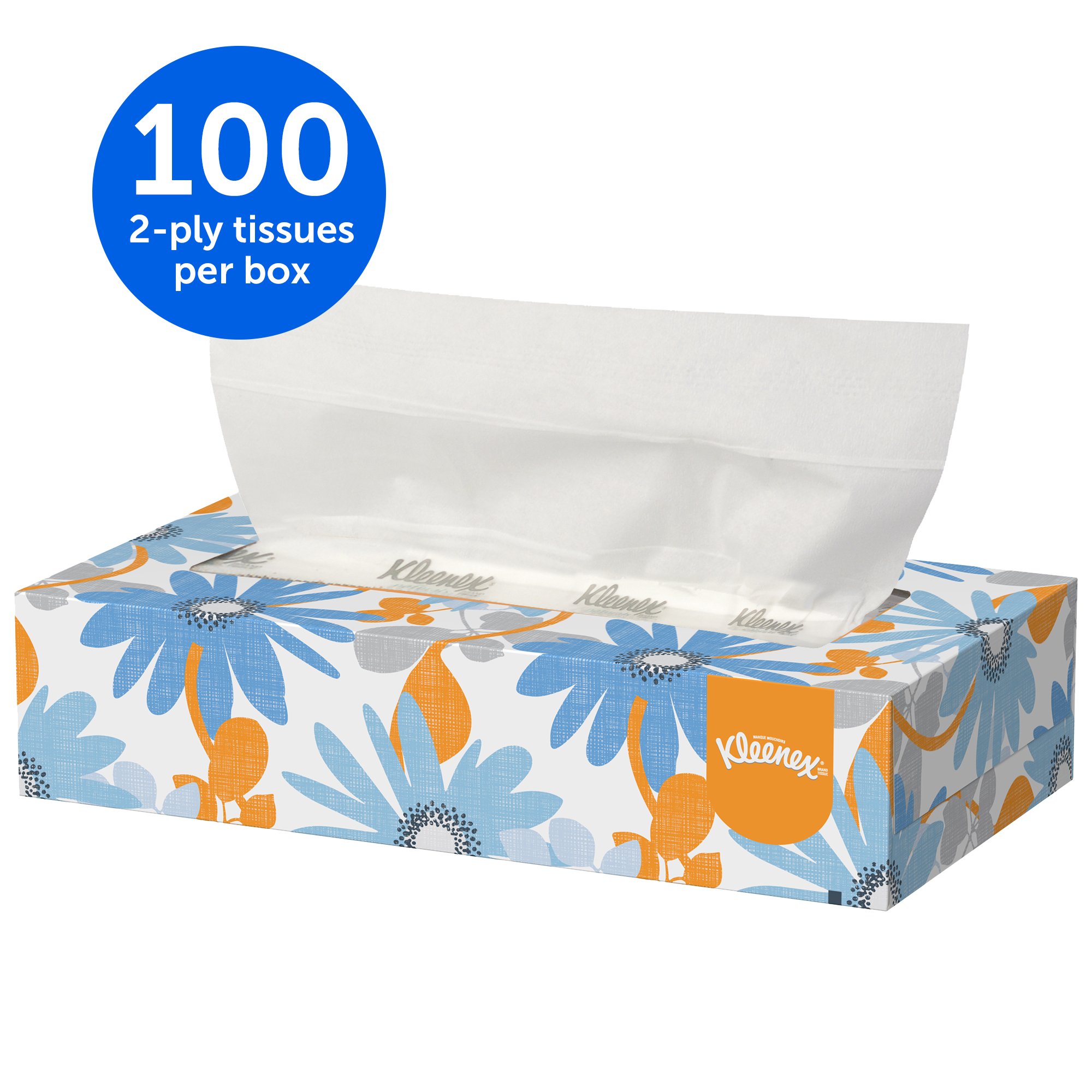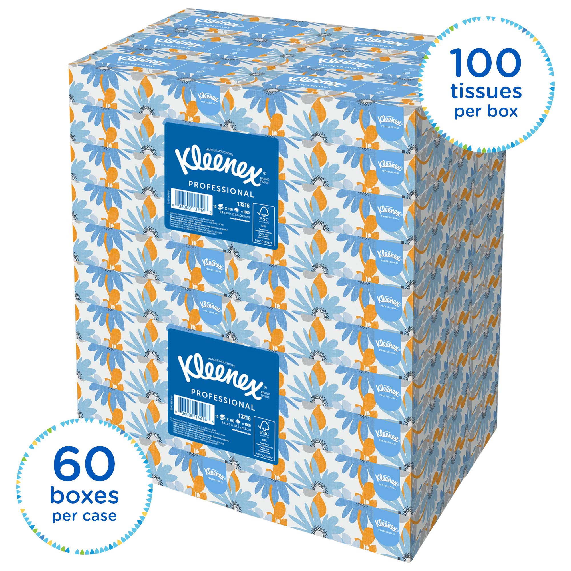 60 boxes of 100 tissues per case (10 bundles of 6 boxes); Each white Kleenex tissue is 8.3" x 7.8", 2-ply, absorbent, soft and strong