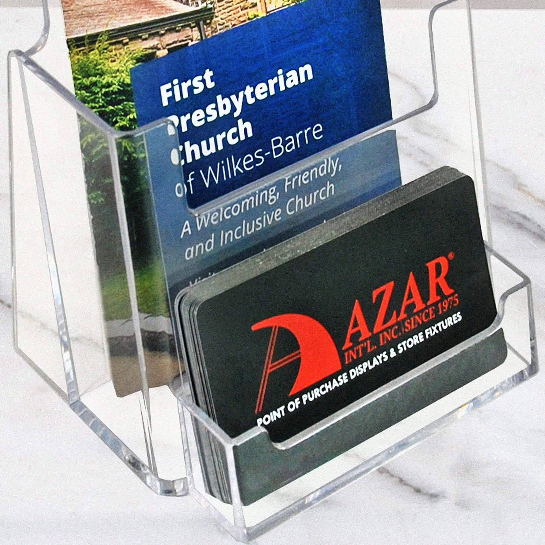 Azar's 252922 counter trifold brochure holder is 40.125-Inch W by 4-Inch D by 7-1/4-Inch H. This brochure holder has an attached business card pocket. It is made of quality acrylic and is perfect to display any type of brochure or advertising material on a counter top. This holder comes in packs of 50.