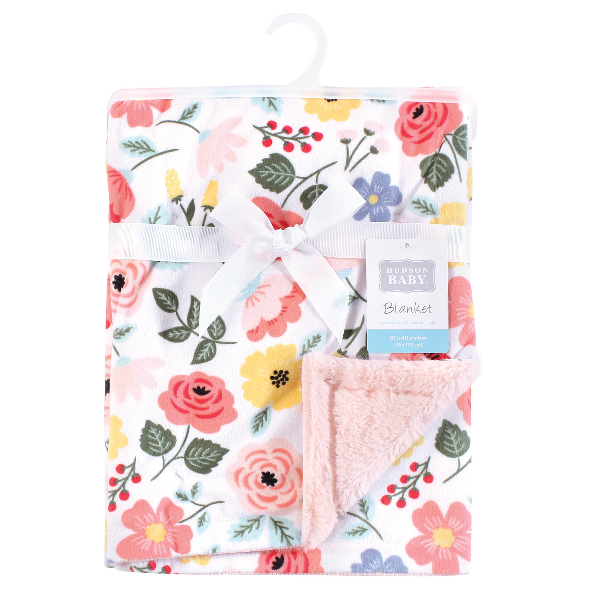 Hudson Baby plush blanket with furry binding is a super soft, warm and cozy baby blanket to add to your little one's nursery. Measuring 30x40 inches, our blanket is soft and gentle on baby's skin and great for everyday use. Our blanket is great for snuggle and sleep, but also as a stroller cover, car seat blanket and more.