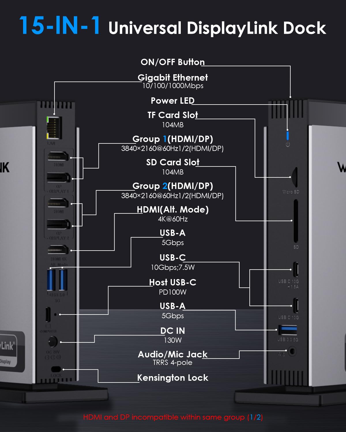 Triple Monitor Docking Station: You can easily connect triple 4K60@Hz displays whether you are Mac or Windows! Experience the special 4K@60Hz high-definition output on the HDMI (Alt.Mode) port for tasks such as video editing and office work. The DisplayLink-6950 chipset supports dual 4K@60Hz DISPLAY on the Display 1/2 (HDMI/DP) port, which is ideal for expanding display options on M1/M2/M3/M4 mac or Windows. ★ Note: Only one of the HDMI and DP ports can be selected.