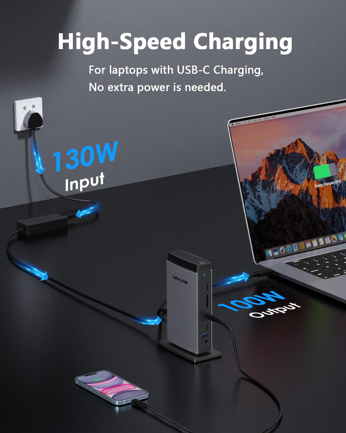 Adequate 100W Power Supply: Equipped with a powerful 130W power adapter, the host's USB-C port can provide up to 100W charging power for laptops. Additionally, the USB-C port can also supply power to charge your phone or other devices, ensuring they operate continuously throughout the day while also powering connected peripherals for data transfer or display. *Please ensure that the host's Type-C port supports power delivery functionality.