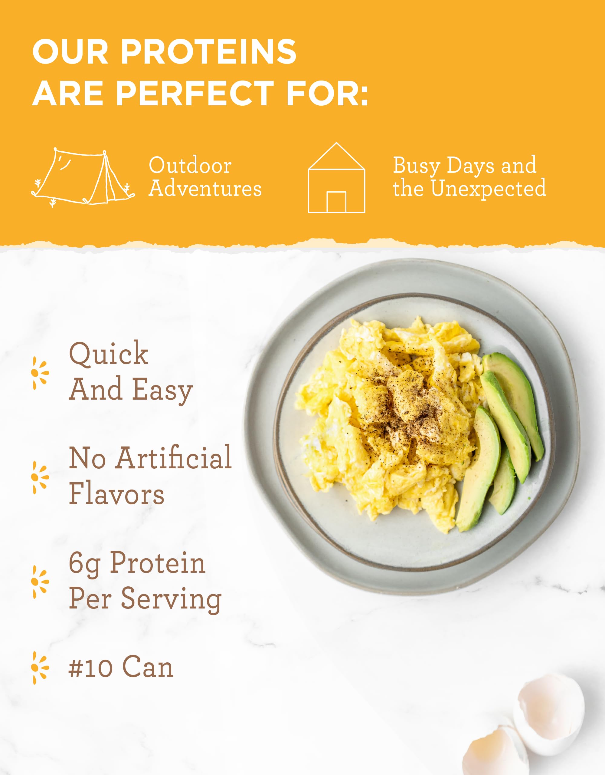 CAMPING & BACKPACKING: Heading into the wilderness? Don't forget our lightweight and easy-to-pack freeze-dried eggs. They're an absolute must for your camping meals. Quick, nutritious, and oh-so-tasty!