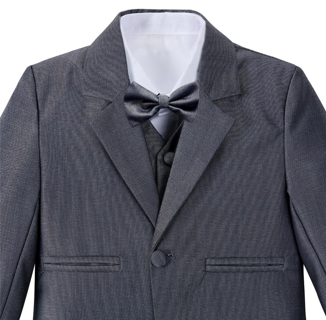 【5 Pieces Little Boys Tuxedo Suit Set】 This smart 5-piece gentleman suit set formal outfit includes blazer jacket, white dress shirt, adjustable bow tie, vest and pants. Made of luxurious polyester (35%) and cotton (65%) fabric. Breathable and comfortable.【Colors】Black, White, Ivory, Light Gray, Silver Gray, Royal Blue, Khaki Beige, Dark Navy Blue, Charcoal Gray, Burgundy Red, Iron Gray. (NOTE: Product color may slightly vary due to the lighting of photo shooting.)