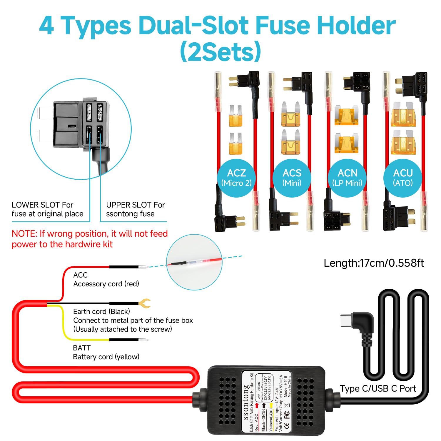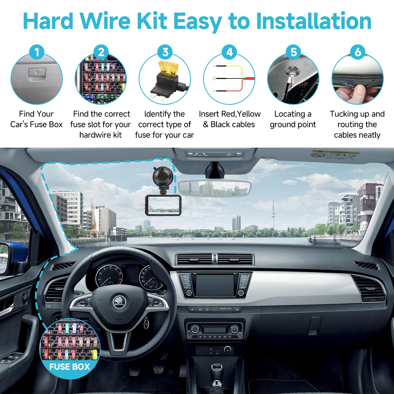 【24 Hour Parking Surveillance Universal Hardwire Kit】- The hardwire kit for dash camera parking add a circuit fuse holders. The 12v hard wire kit connected to car battery or fuse box power, can uninterruptedly supply power for dash camera for 24 hours. Keeps it powered even after engine off, protect your car all day