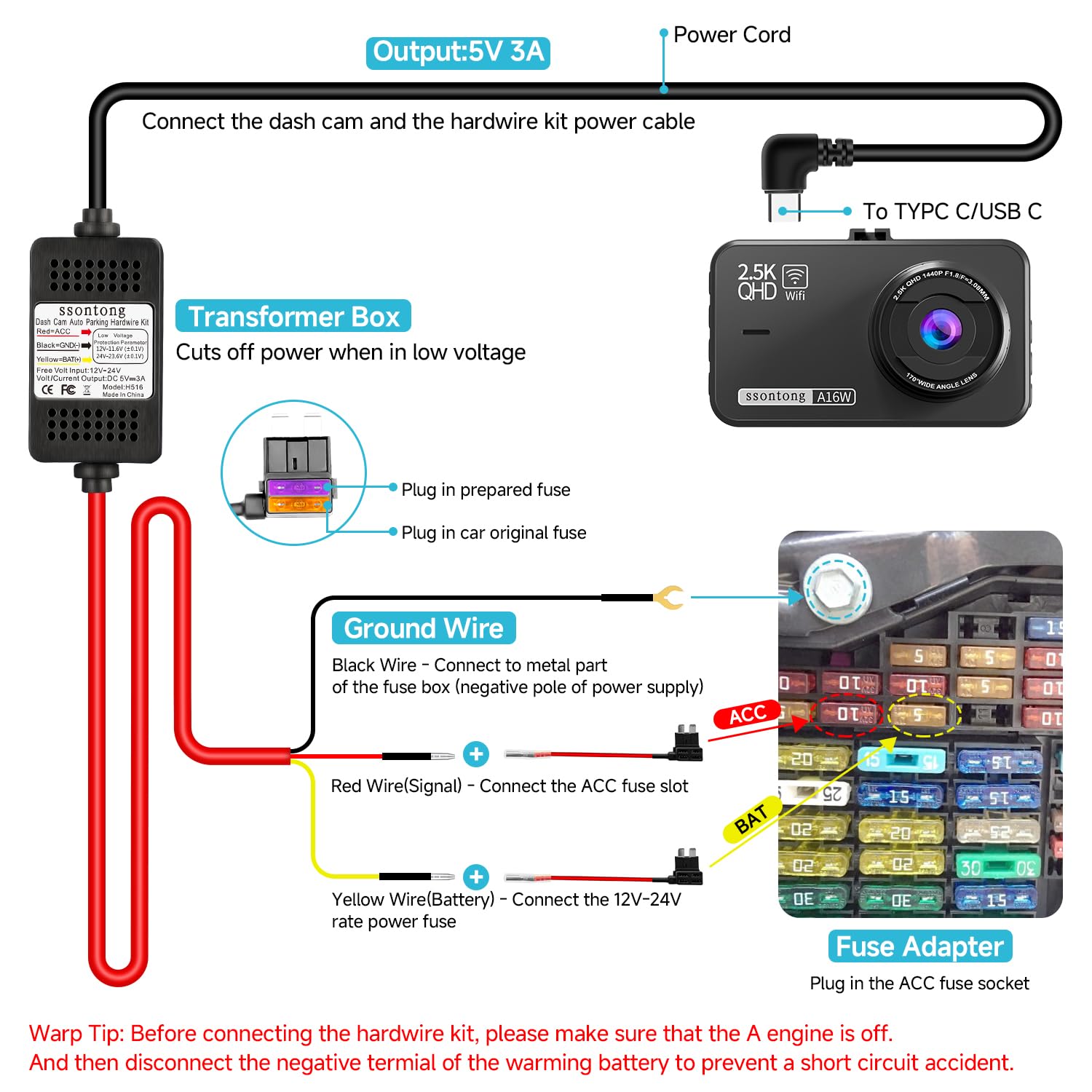 【ACC Mode 3 Lead Hard Wire Kit】- The universal dash cam hardwire kit Support ACC detection. The yellow wire cable should be connected to the BAT+ fuse slot. The red wire cable should be connected to the ACC fuse slot. The Ground cable (Black wire cable) should be connected to any metal in the car. The 3 wire dash cam hardwire kit included 2pcs fuse tap to work with the hardwire cable. The usb c hardwire car kit comes w/ an adapter cable, 3-lead hardwire kit can support any dash cams