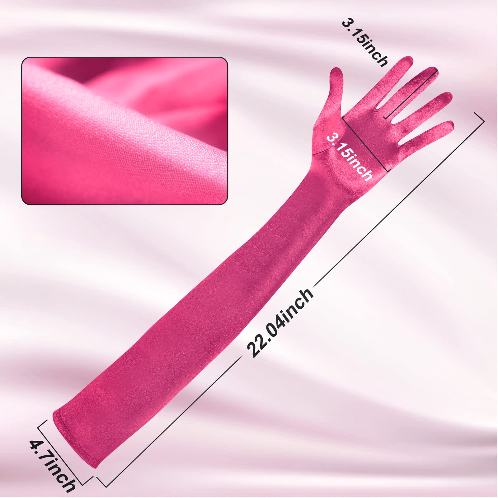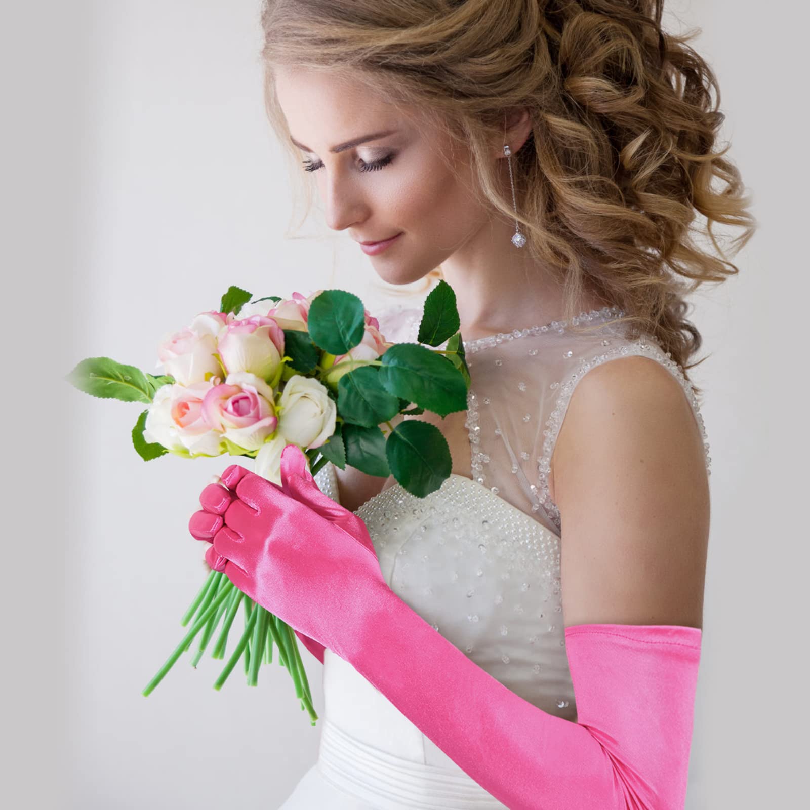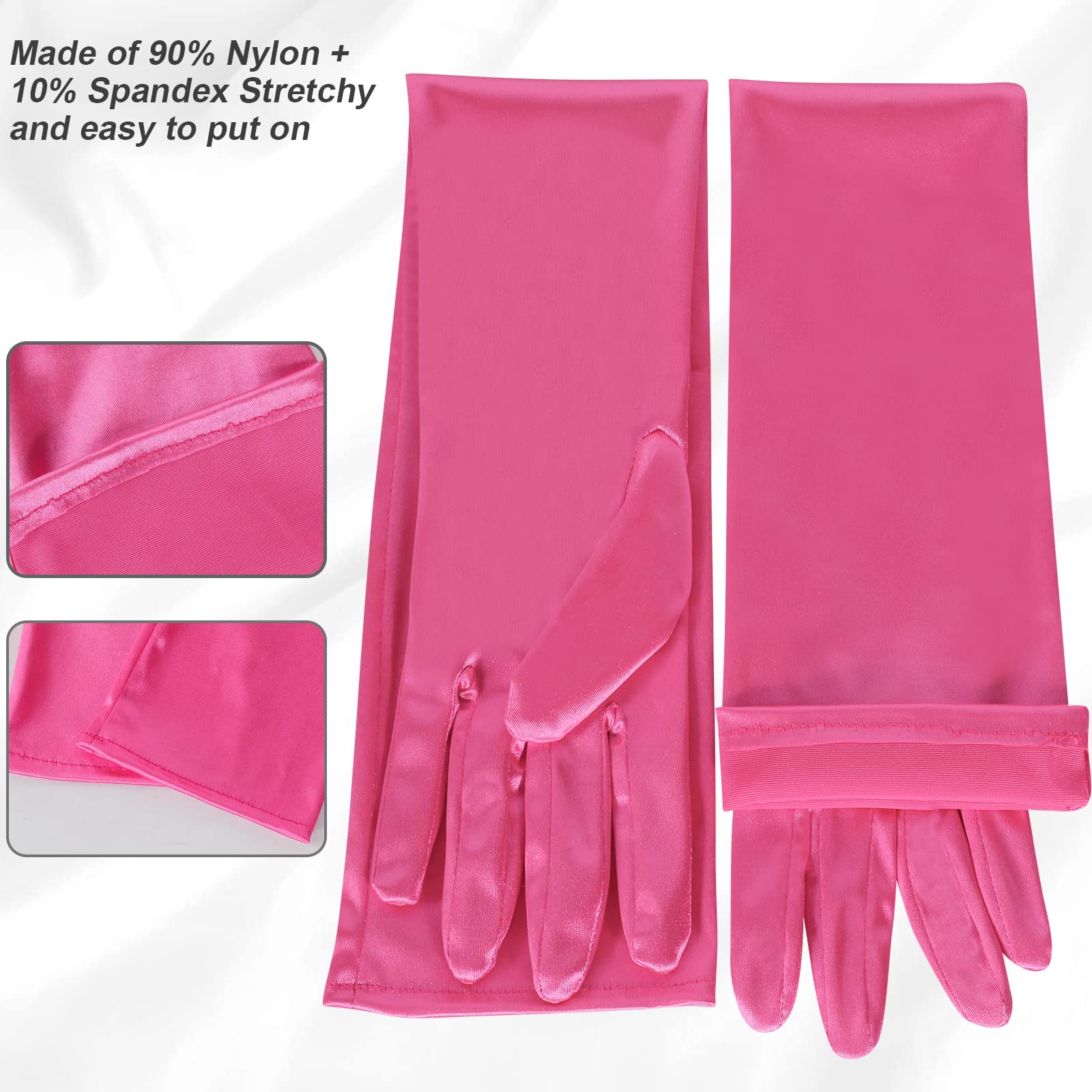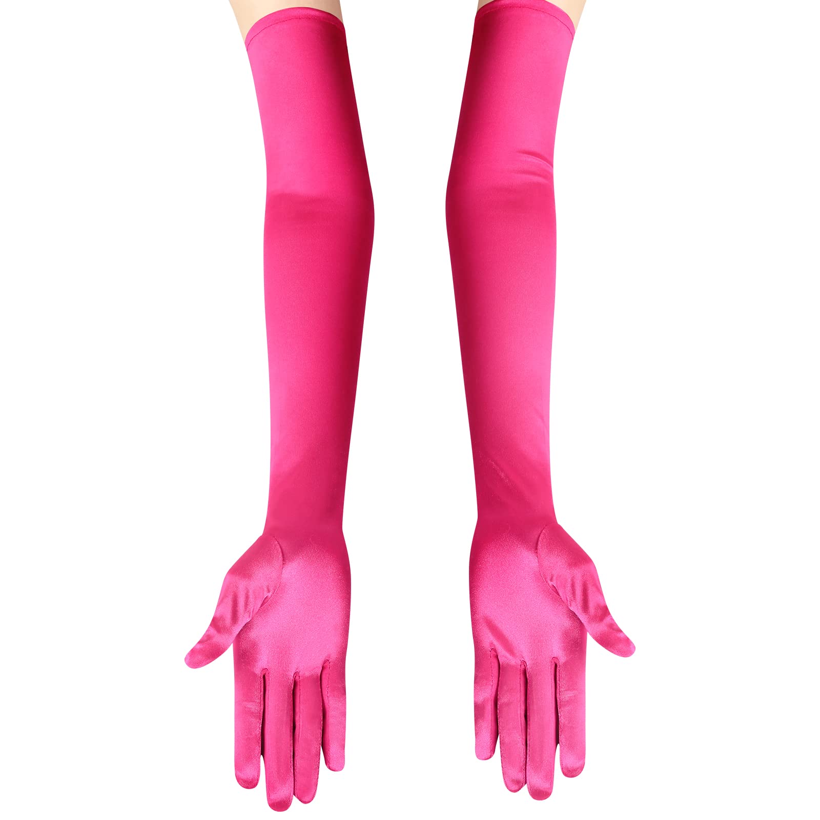 Description Women's White Long Satin Gloves Bridal Dance Gloves For Special Occasion Evening Party, Black, White, Pink, Red Material: Made of 90% Nylon + 10% Spandex, stretchy and easy to put on. Stretch ,soft, smooth, sleek, comfortable to wear The best to hand wash and air dry. Package include: 1 Pair Gloves.