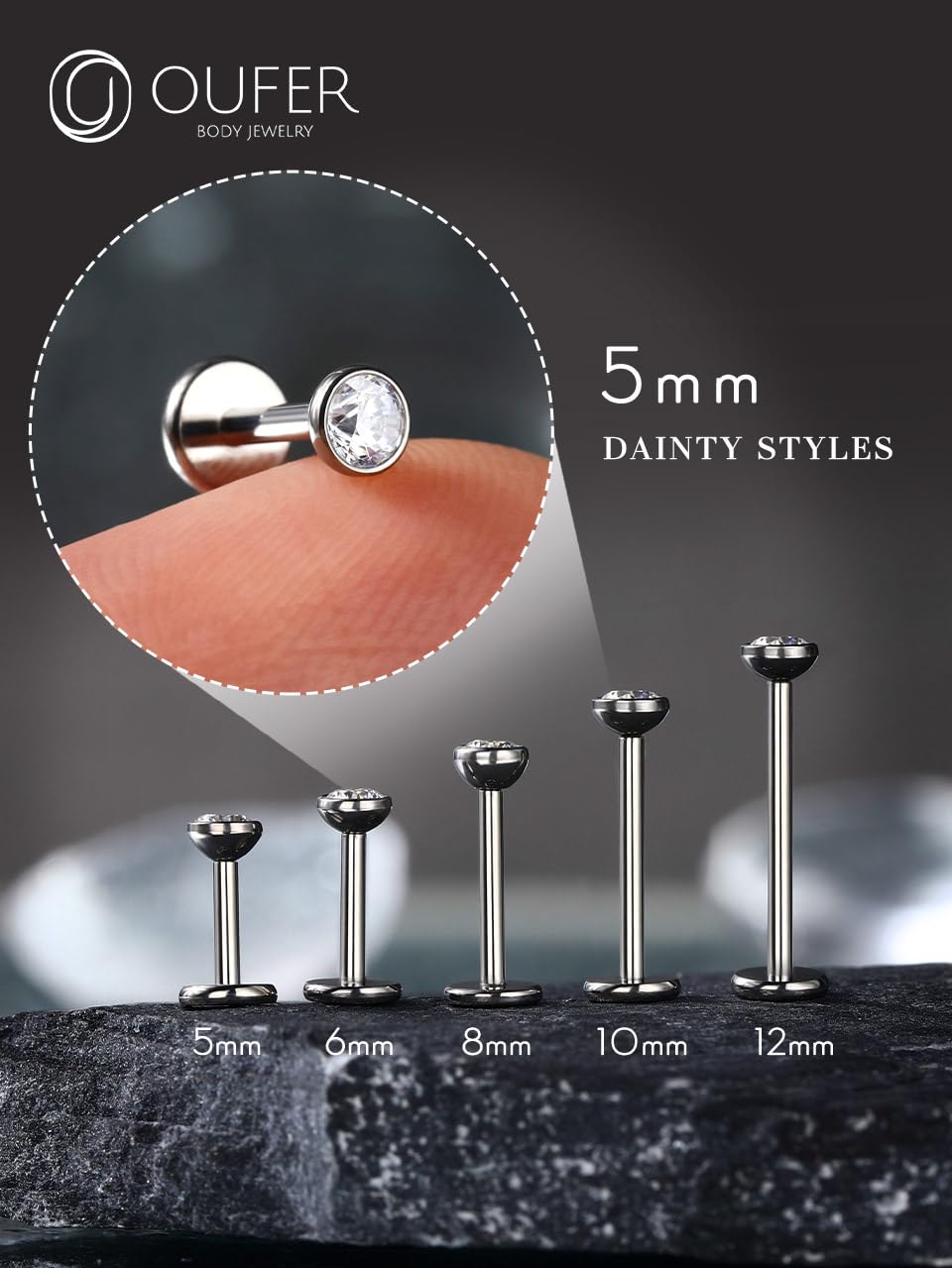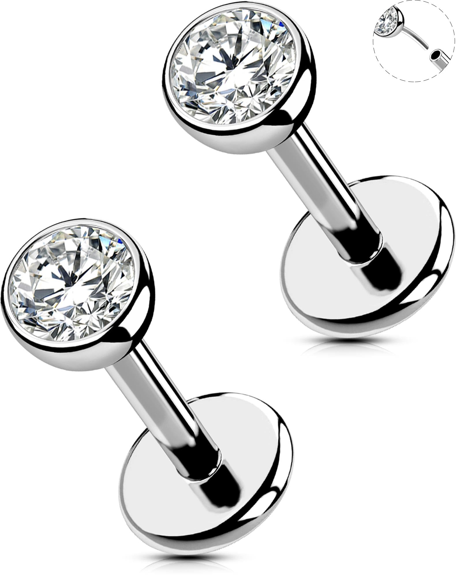 【Standard Flat Back Studs Size】: Gauge = 18g(1.0mm), bar length = 5mm(13/64''), diameter of CZ = 3mm. The flat back studs are normal and standard size for helix cartilage labret piercing jewelry.