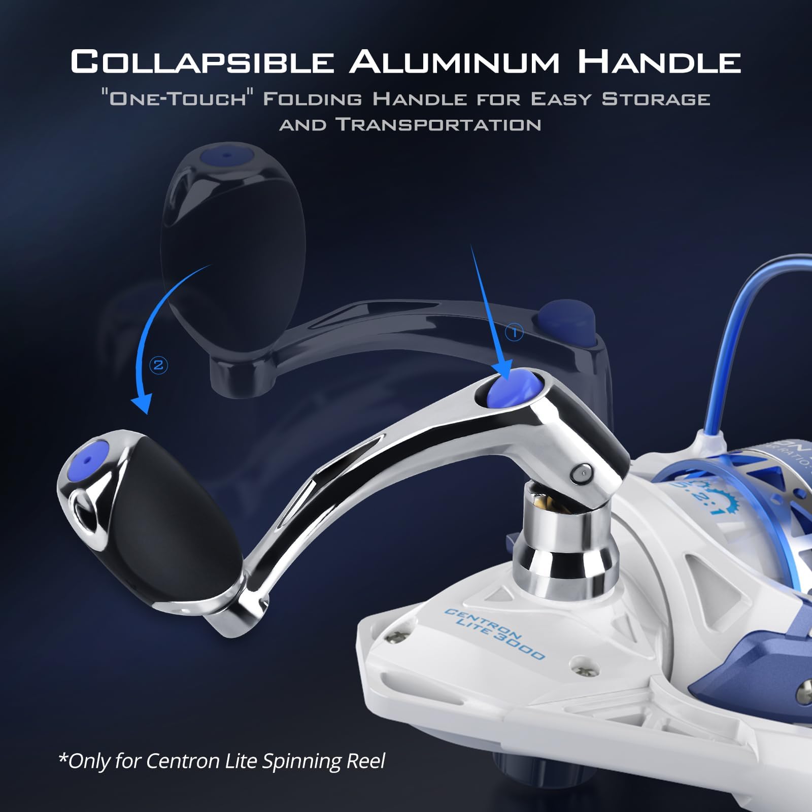 Two Color Options - KastKing Centron Spinning Reel in black-blue offers the best value at any level. The KastKing Centron Lite Fishing Reel in white-blue that there is a Collapsible Handle turns any angler into a PRO. Sizes 500 & 1000 are Perfect for Ice Fishing.