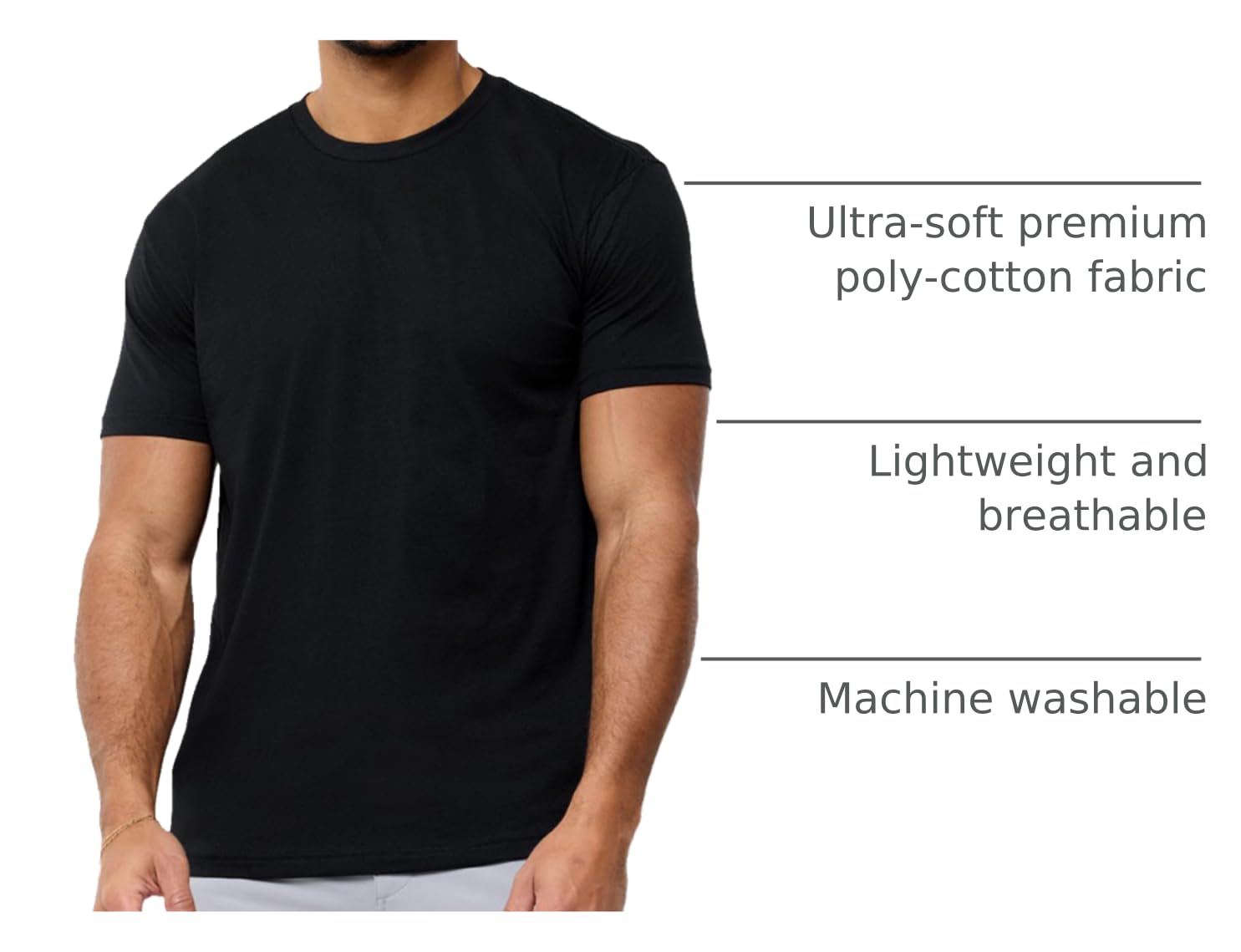 DURABLE 4-WAY STRETCH SHIRTS FOR MEN: These black tees for men are built to keep up. The flexible fabric offers total freedom, while the polycotton in this mens black t shirt is engineered to resist shrinking & color fading.