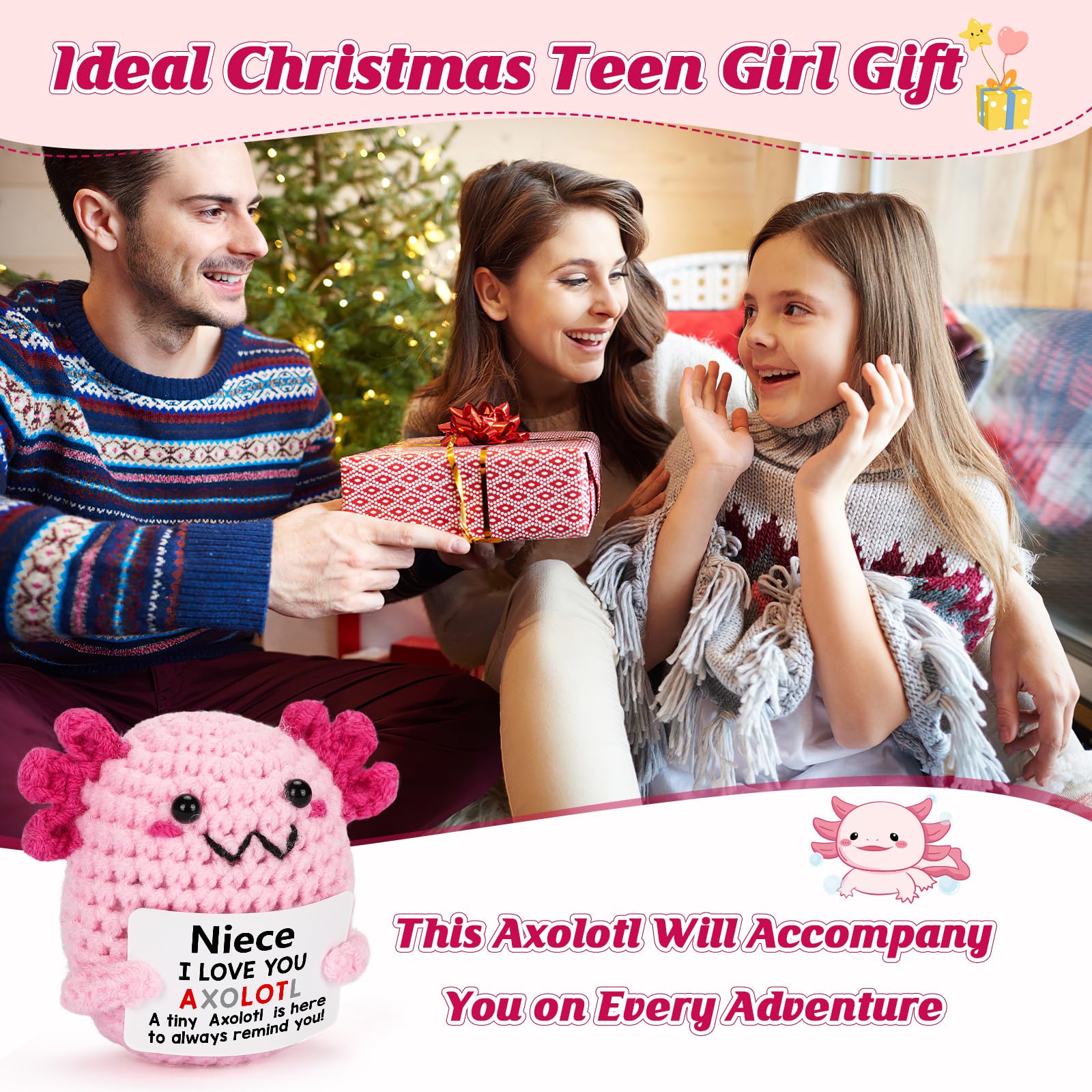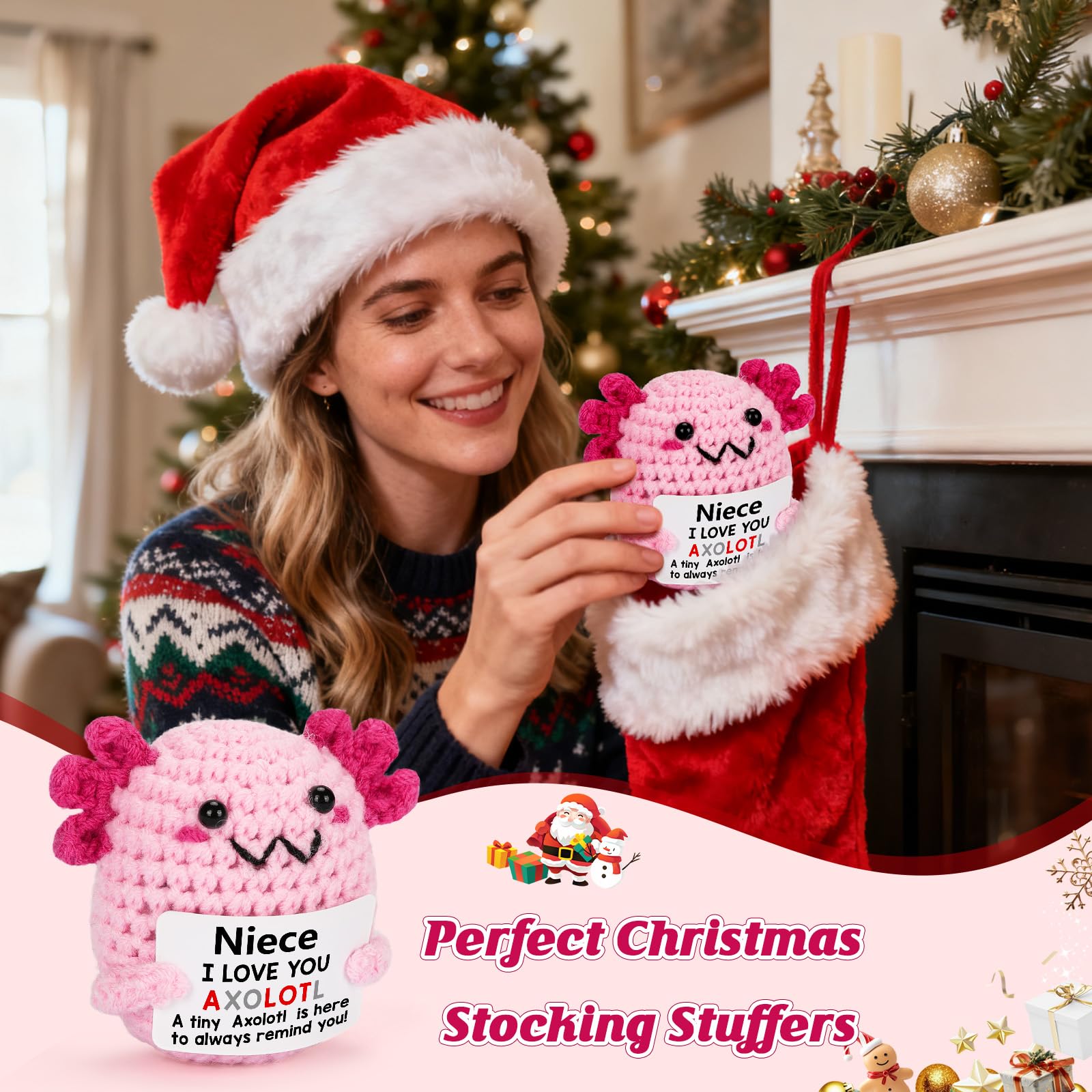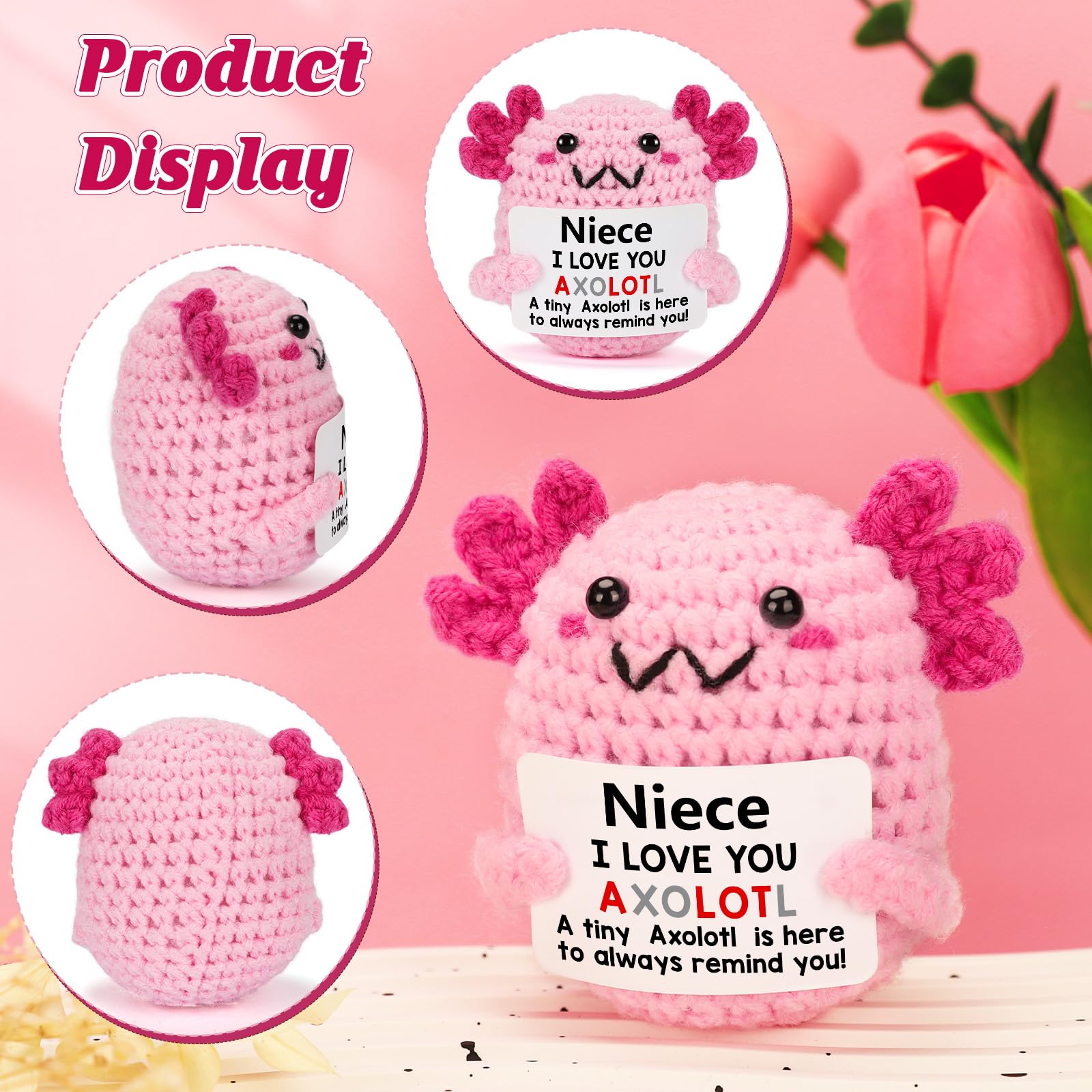 Thoughtful Mini: Pink axolotl holding a 5×3 cm message card to “Niece”.