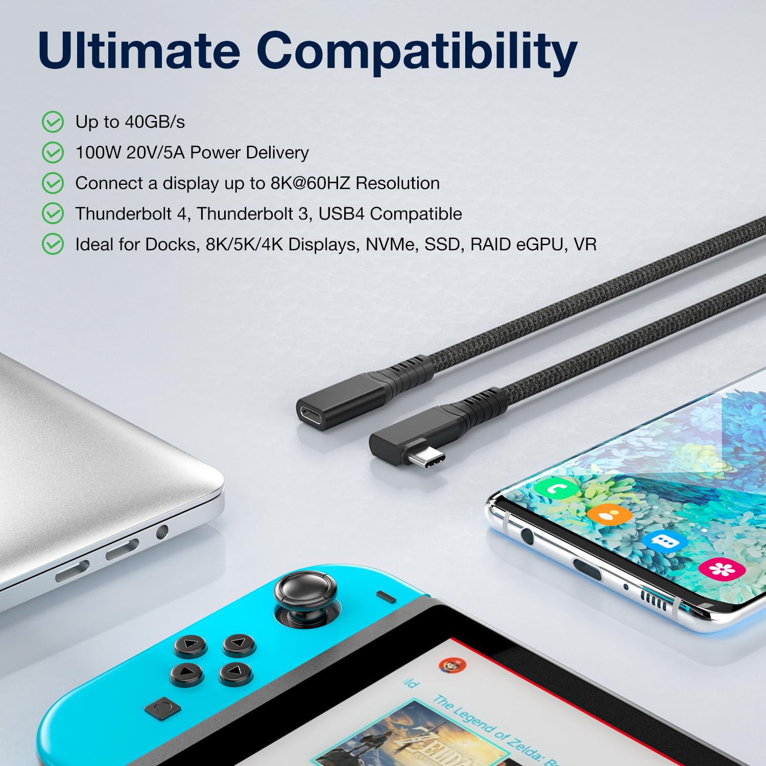NEW Right-angled USB4 Extension Cable:Innovative 90 degrees L design, protect the plug and extend the life of cable by reducing the strains of everyday use. It perfectly works for USB C/USB-C, USB 4 / USB4, Thunderbolt 4 and Thunderbolt 3 devices,such as Thunderbolt 3 & 4 docking station, Thunderbolt 3 & 4 cable, Thunderbolt 3 Monitor, Thunderbolt Laptop, iPad Pro 2021, Mac Mini M1 External SSD eGpu Dell and more.