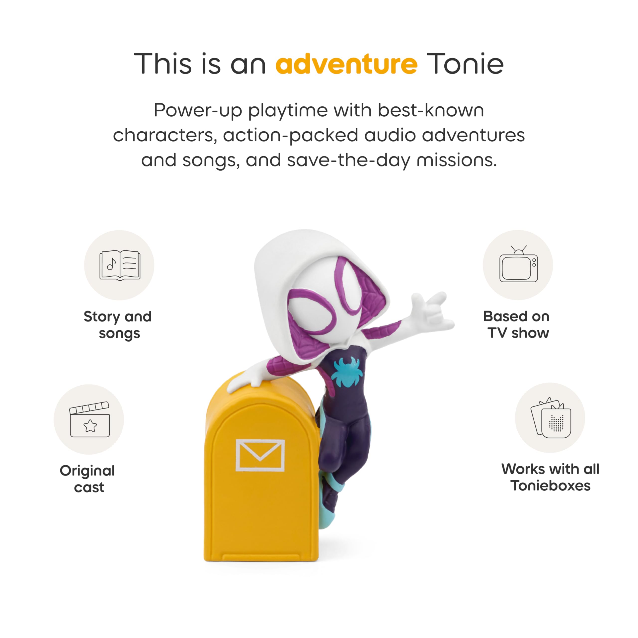 Includes Ghost-Spider toy character with 3 songs, 1 story and total run time of approximately 41 minutes. Recommended Age Range: 3+, Language: English.