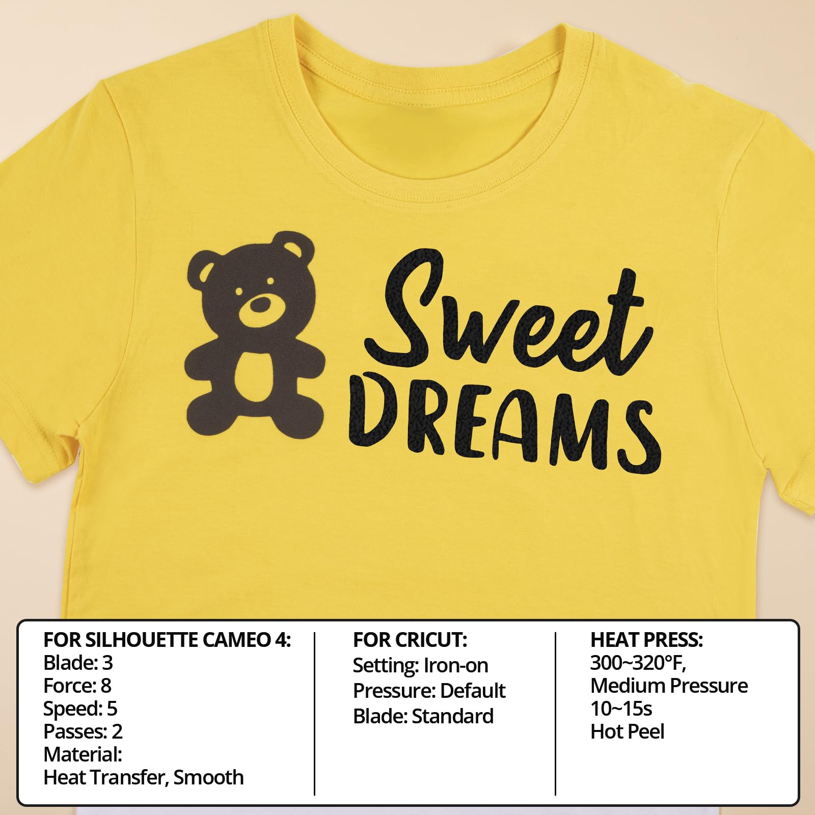 【KINDLY NOTES】1. Due to the particularity of the process, our puff heat transfer vinyl is recommended to be used on pure cotton fabrics, and the effect will be better. 2. Due to the unique craftsmanship of puff HTV, please do not repeatedly wash and cut smaller patterns. 3. Puffs of different colors exhibit different effects at different temperatures. 4. The puff heat transfer vinyl is not recommended to be laminated and ironed upwards