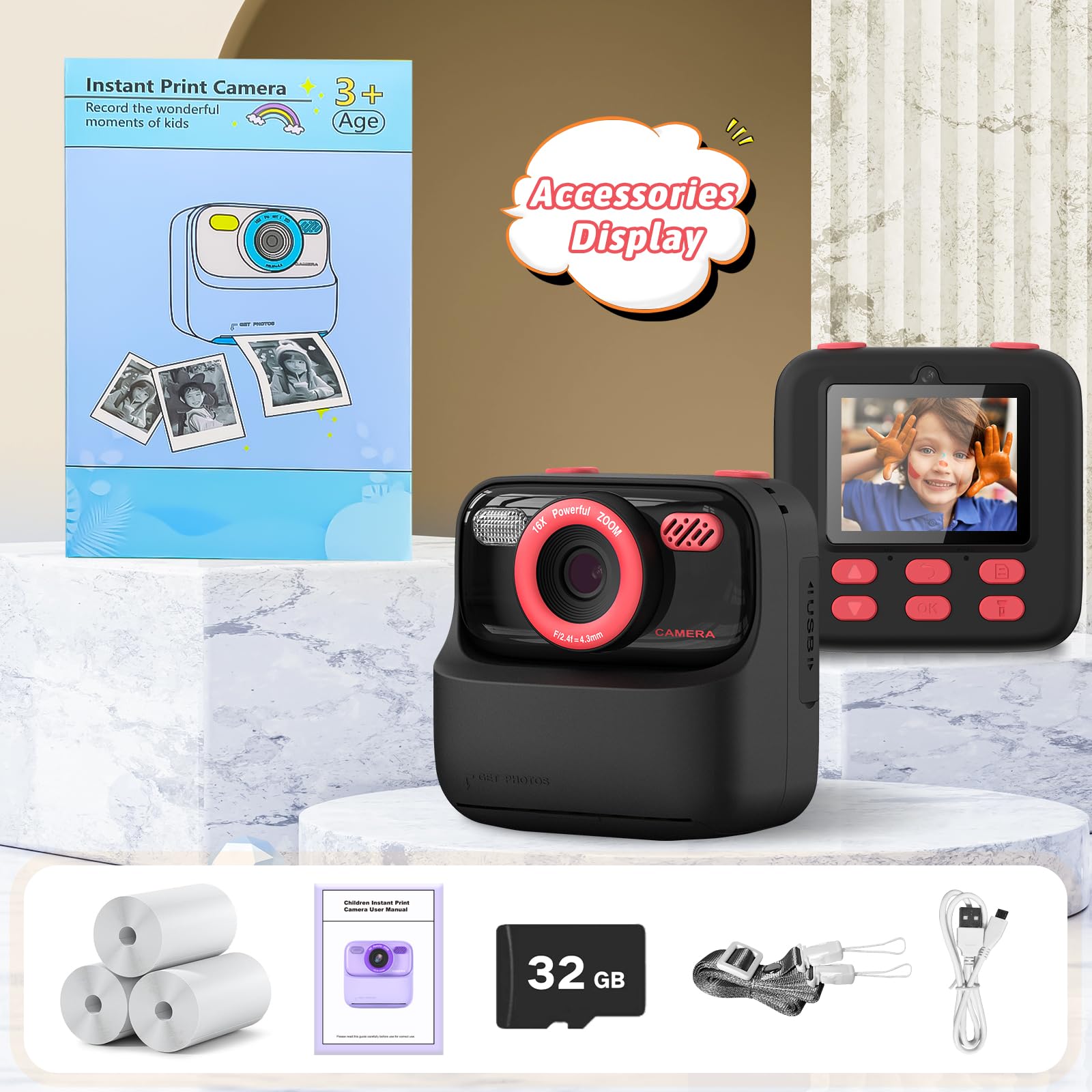 【Why You Can Choose Our Kids Camera With Confidence】It comes with: 1x Kids Instant Print Camera, 3x Printer Paper, 1x Exquisite Gift Packing Box, 1x USB Charging Cable, ,1x 32GB SD Card (Have Installed in the SD Slot ), 1x Hanging Lanyard, 1x User Manual. If you have any questions with our products or service, please contact us anytime, and we will provide you with perfect solutions as soon as possible, It will be the favorite gifts your child has ever received.