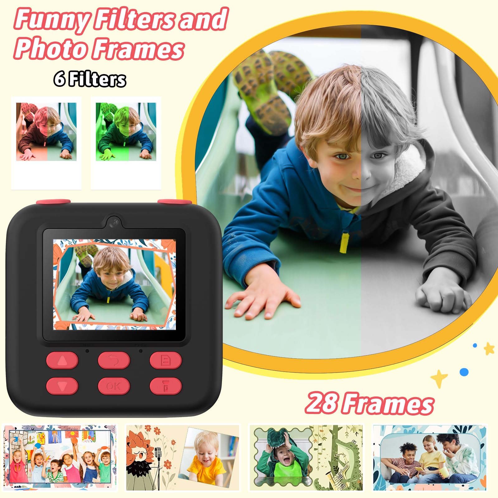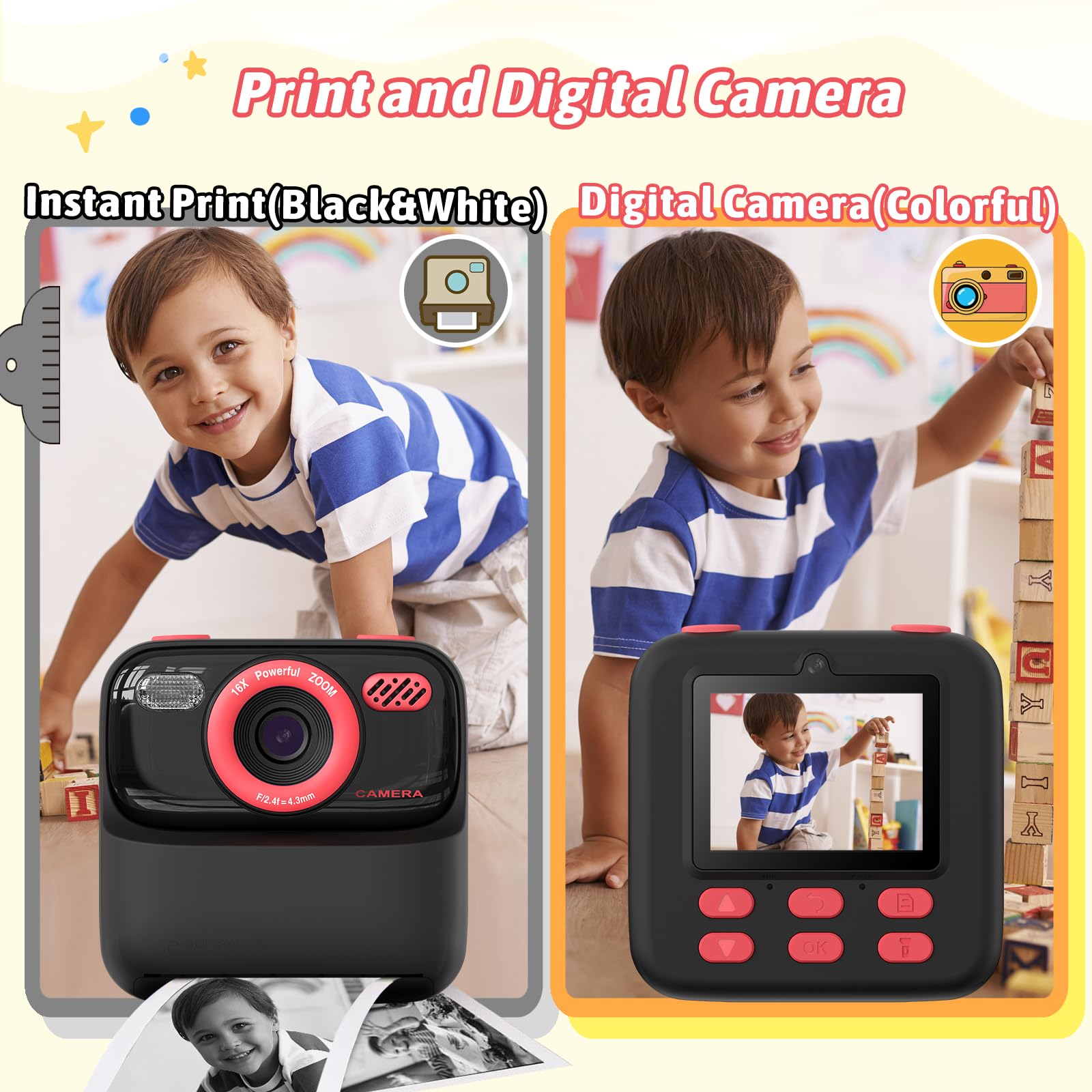 【Creative Instant Print Camera Special Designed for Kids】This kids digital camera with an instant printing function, you can obtain color photos store in SD Card while quickly printing black and white photos, our kids cameras are equipped with 2 print modes, grayscale and dot matrix printing, and 3 types of color depth printing. With Advanced thermal printing technology, no toner and BPA, it is very safe to kids. It helps Recording your child's happy growth, develop kids imagination and creativity, enhance the fun of parent-child interaction.