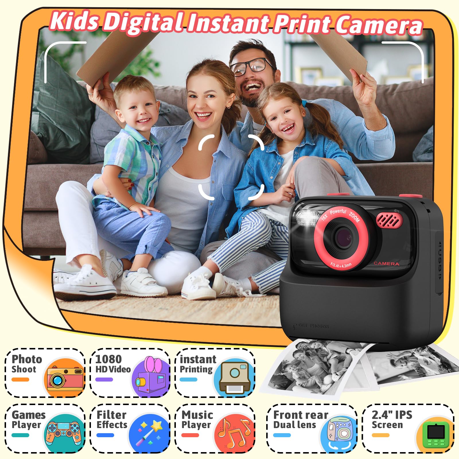 【Multi-functional Kids Digital Instant Print Camera】This digital camera has instant printing, flash, 2.4-inch large screen, 3 puzzle games, 28 cute frames and 6 filters, selfie dual cameras (Front/Rear lens), real-time video recording, time lapse capture, MP3 music player.