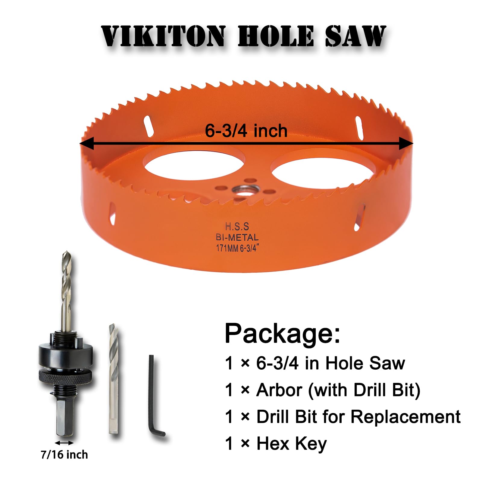 Package Include: 6-3/4 in hole saw, 1 pc arbor(with 1 drill bit), 1 pc drill bit for replacement, 1 pc hex key