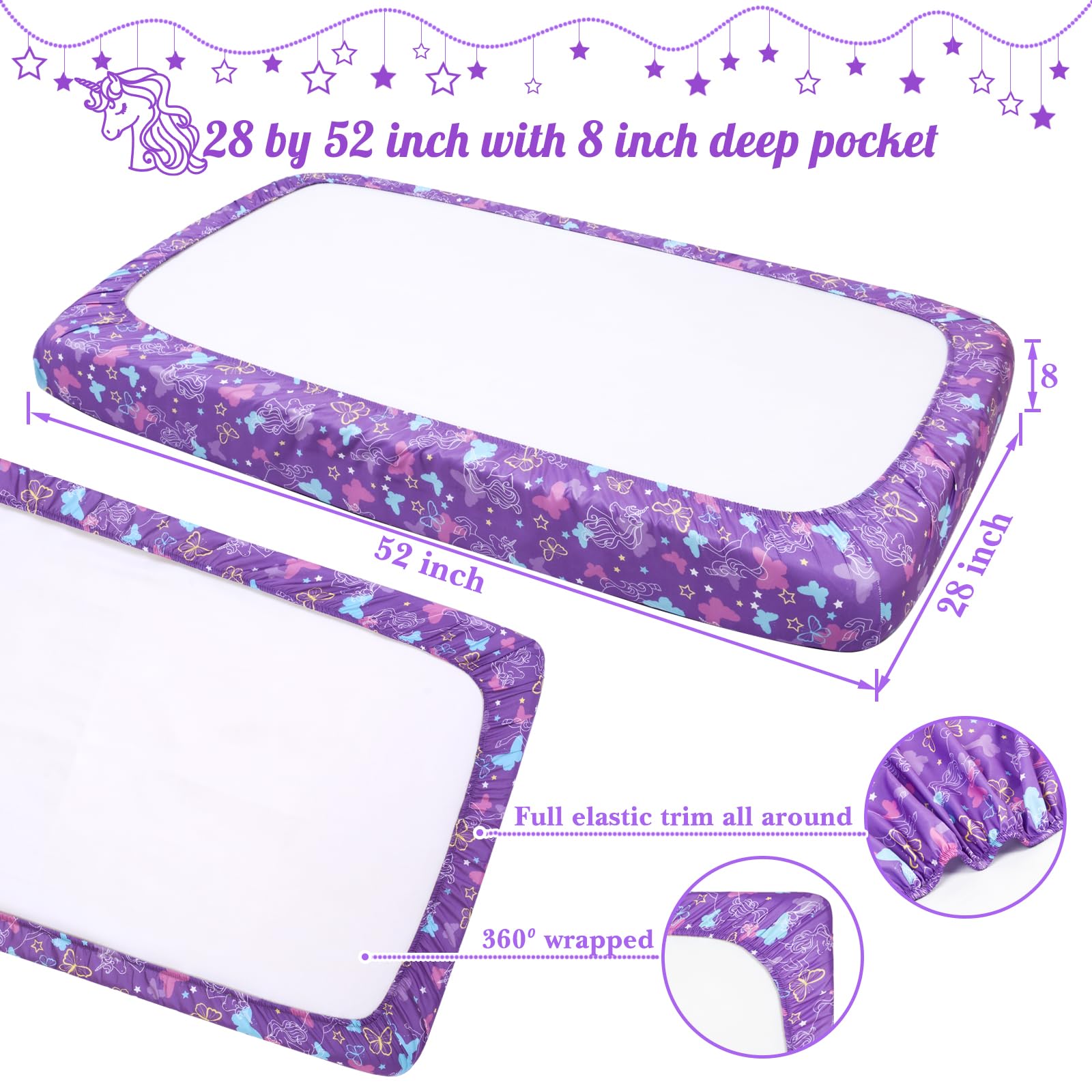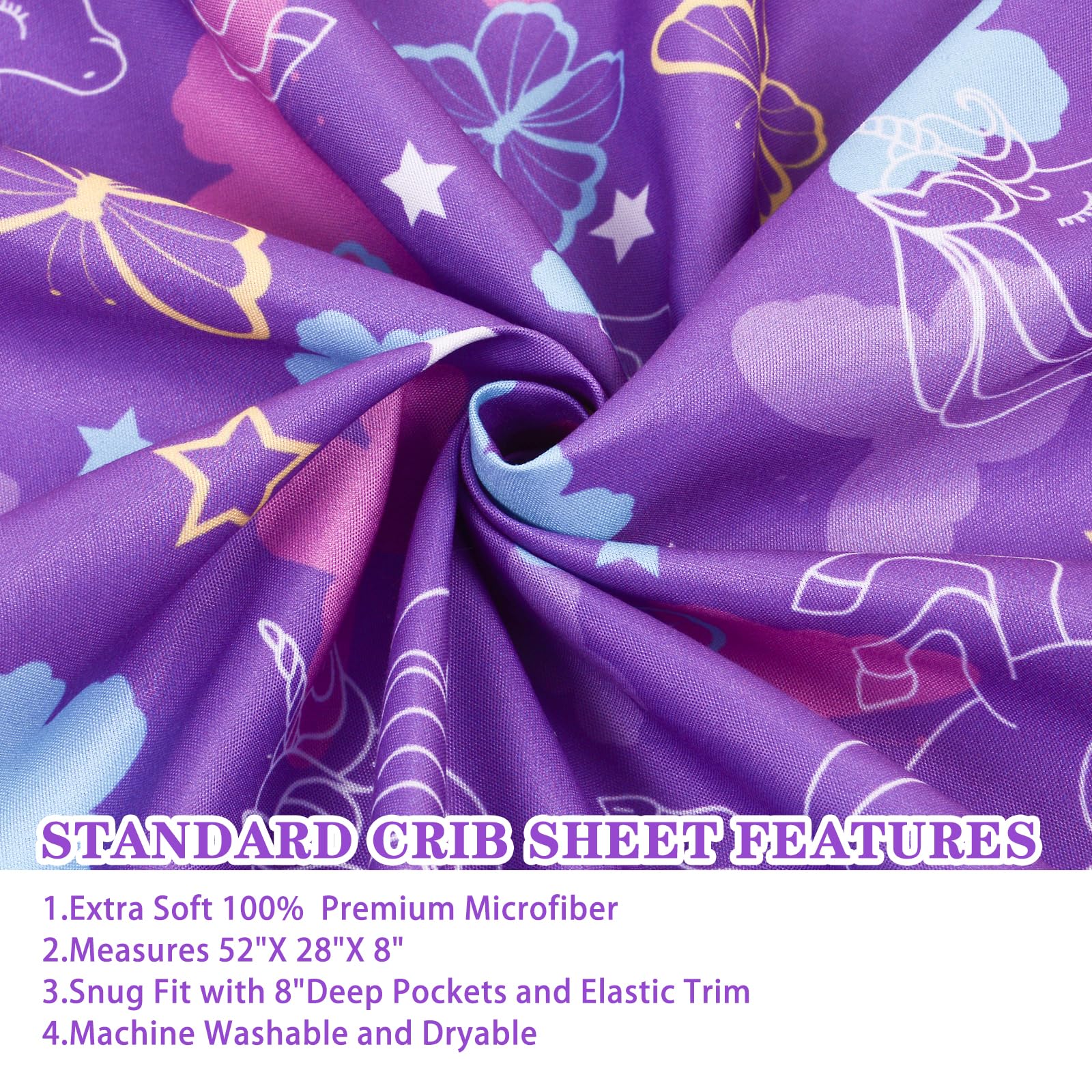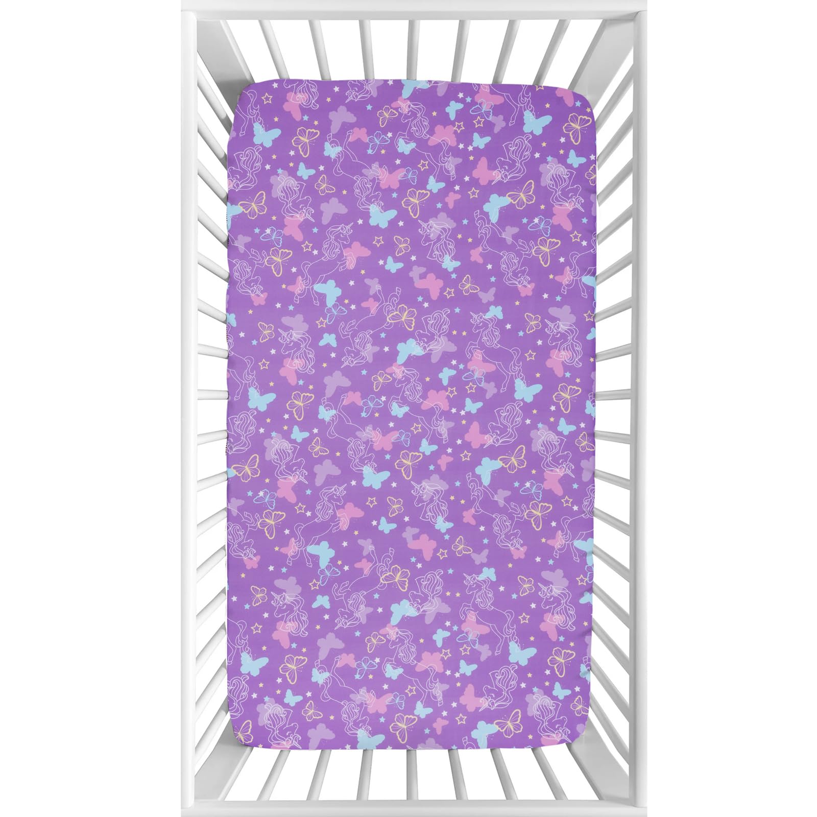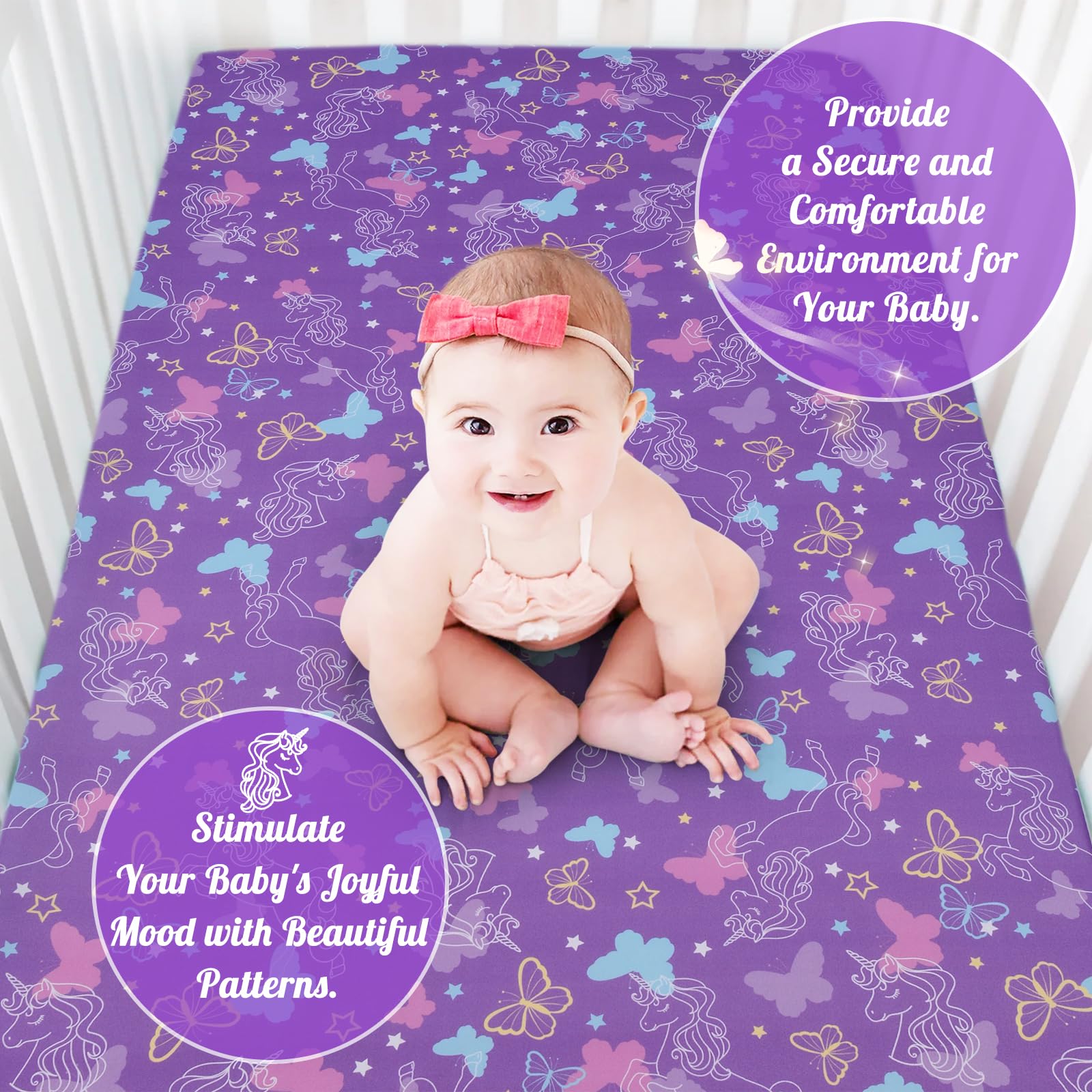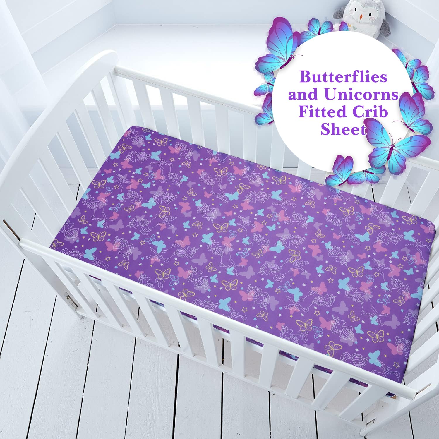 Enchanting Butterfly & Unicorn Design: Featuring magical butterflies and unicorns on a dreamy purple background, this sheet transforms your nursery into a whimsical wonderland. The gender-neutral palette suits any babyβs room decor.