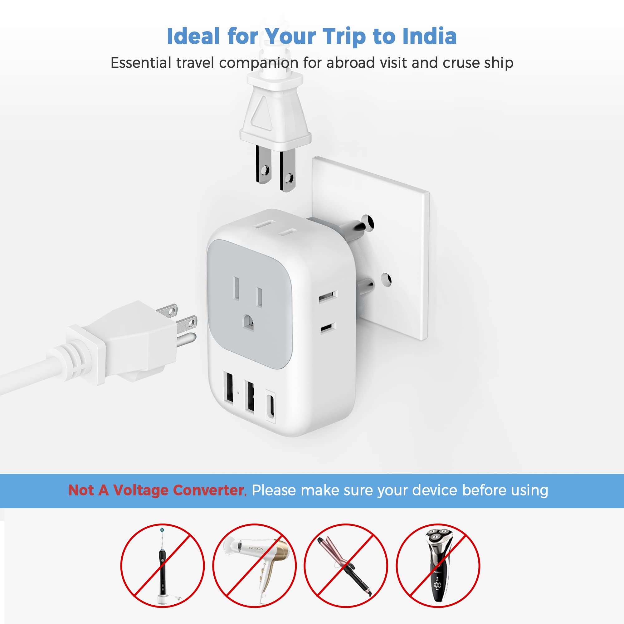 India Travel Adapter with USB C: Dual USB A ports can charge up to 2.4A, the USB C port provide charging speed up to 3A; 2 types of USB ports can detect charged devices and give you more charging options; Ideal for cell phone, tablet, earphone, etc