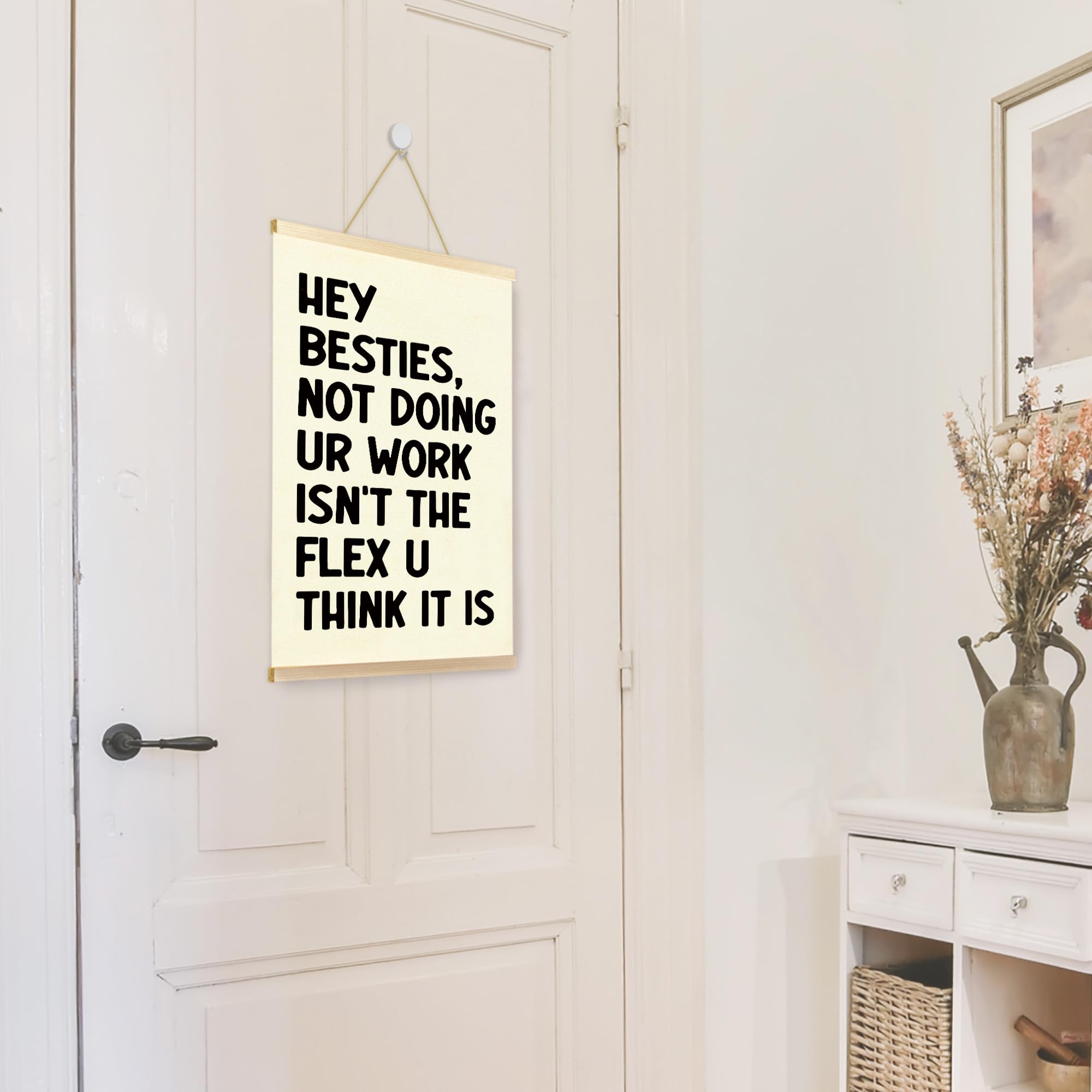 Printed on natural linen fabric with solid wood bars on top and bottom. The wooden frame provides durability, and the linen material enhances the overall aesthetic appeal.