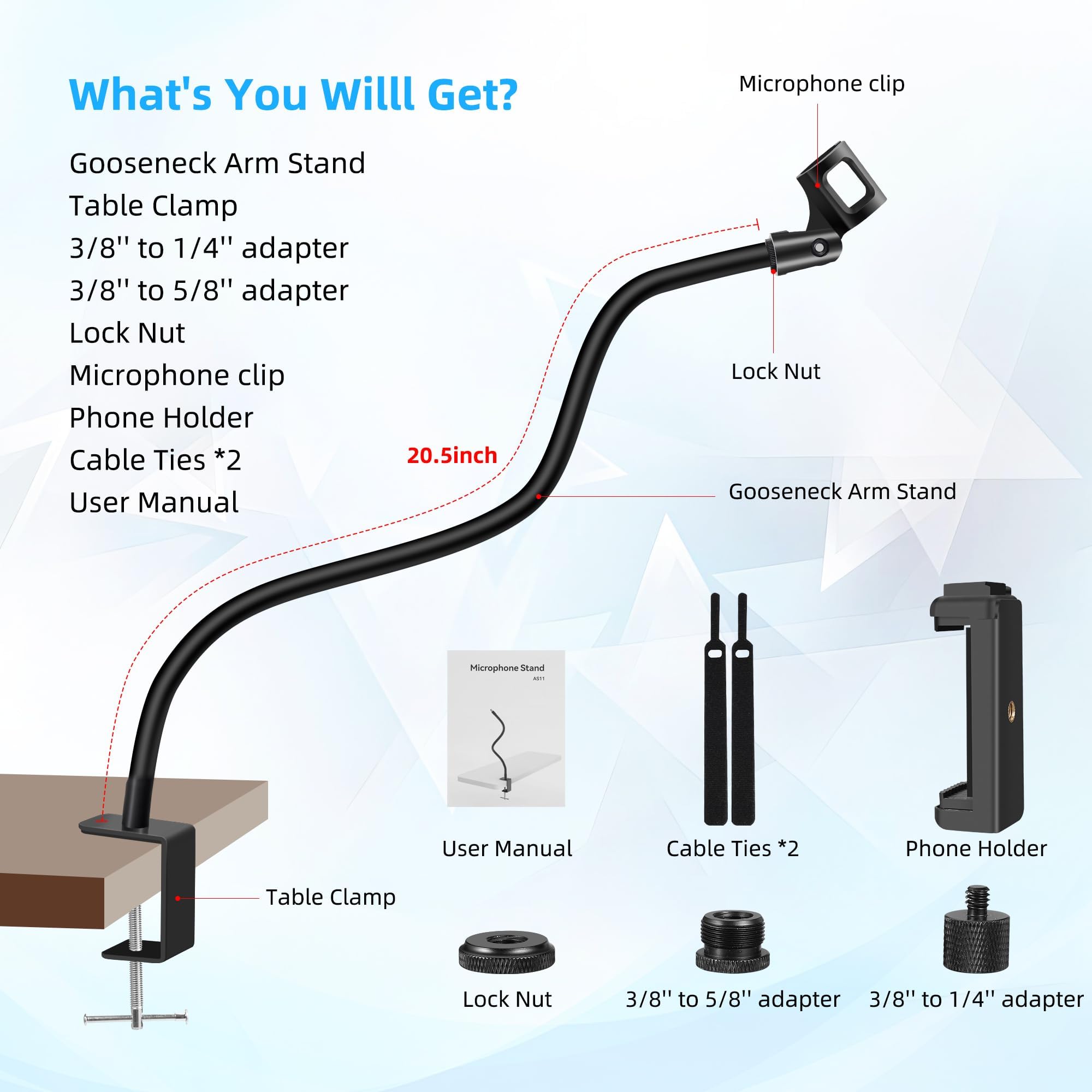20.5'' Extended Gooseneck Mic Stand: Prizmora gooseneck stand with a length of 20.5 inches,longer than other small mic stand. This flexible microphone holder is Easy to assemble and very easy to use the long mic arm.The stiff, solid, stable, sturdy microphone arm stand makes talking or recording from a natural position so much easier.