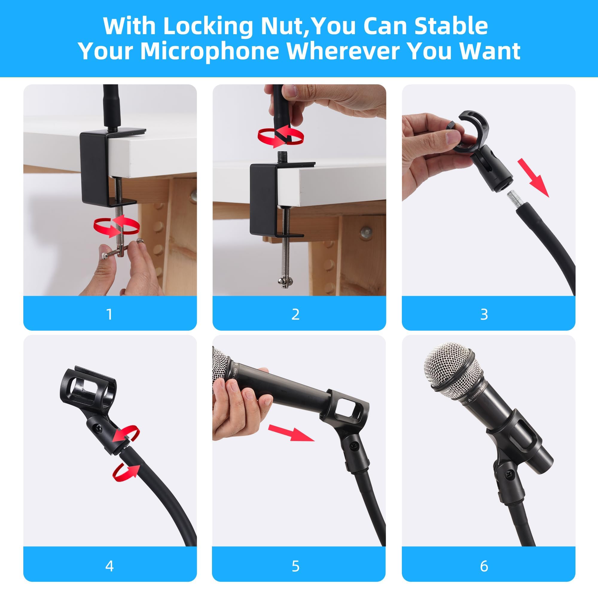 360° Adjustable Flexible Mic Stand: The microphone stand arm is designed to bend back and forth 360 degree directional.This desk mic stand gooseneck holds position very well and can bend out enough stay in position.The arm stand is super adjustable to allow you to adjust your microphone to the perfect position with its extra long flexible gooseneck arm.
