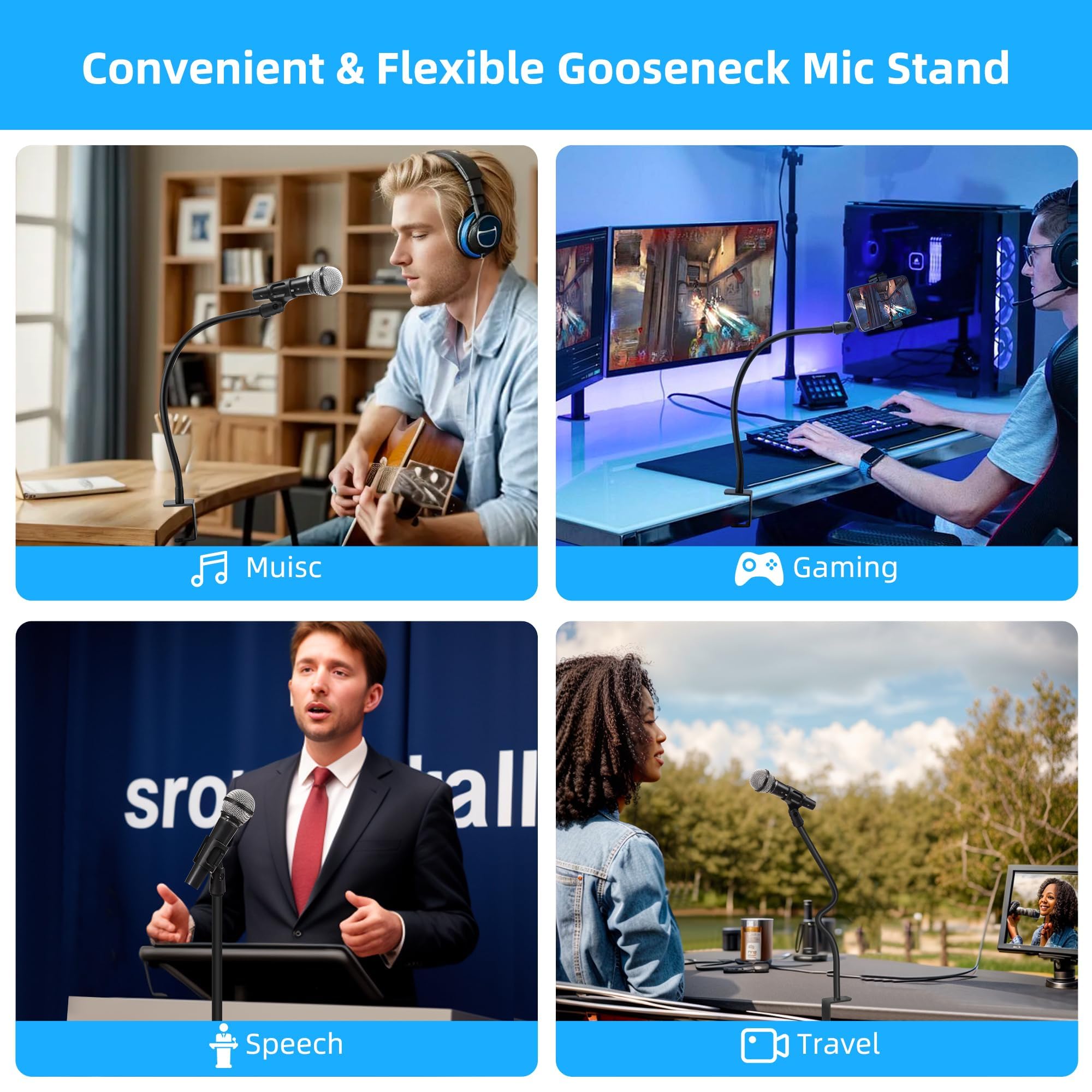 Portable Gooseneck Mic Stand: Portable table edge mount microphone stand.The gooseneck desktop stand that can be used for home recording,meeting,podcasting and perfect for a vlogger, a podcaster, urban sketcher,creators ,a live streaming,guitar etc.It makes the sound professional and clear.