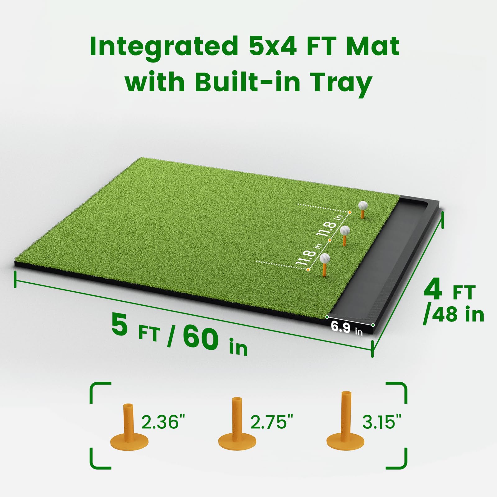 Integrated Ball Tray – This 5x4 ft golf hitting mat includes a built-in ball tray with a 0.6inch raised edge for easy access and ball storage. The integrated design simplifies setup, reduces clutter, and keeps your indoor or outdoor practice organized