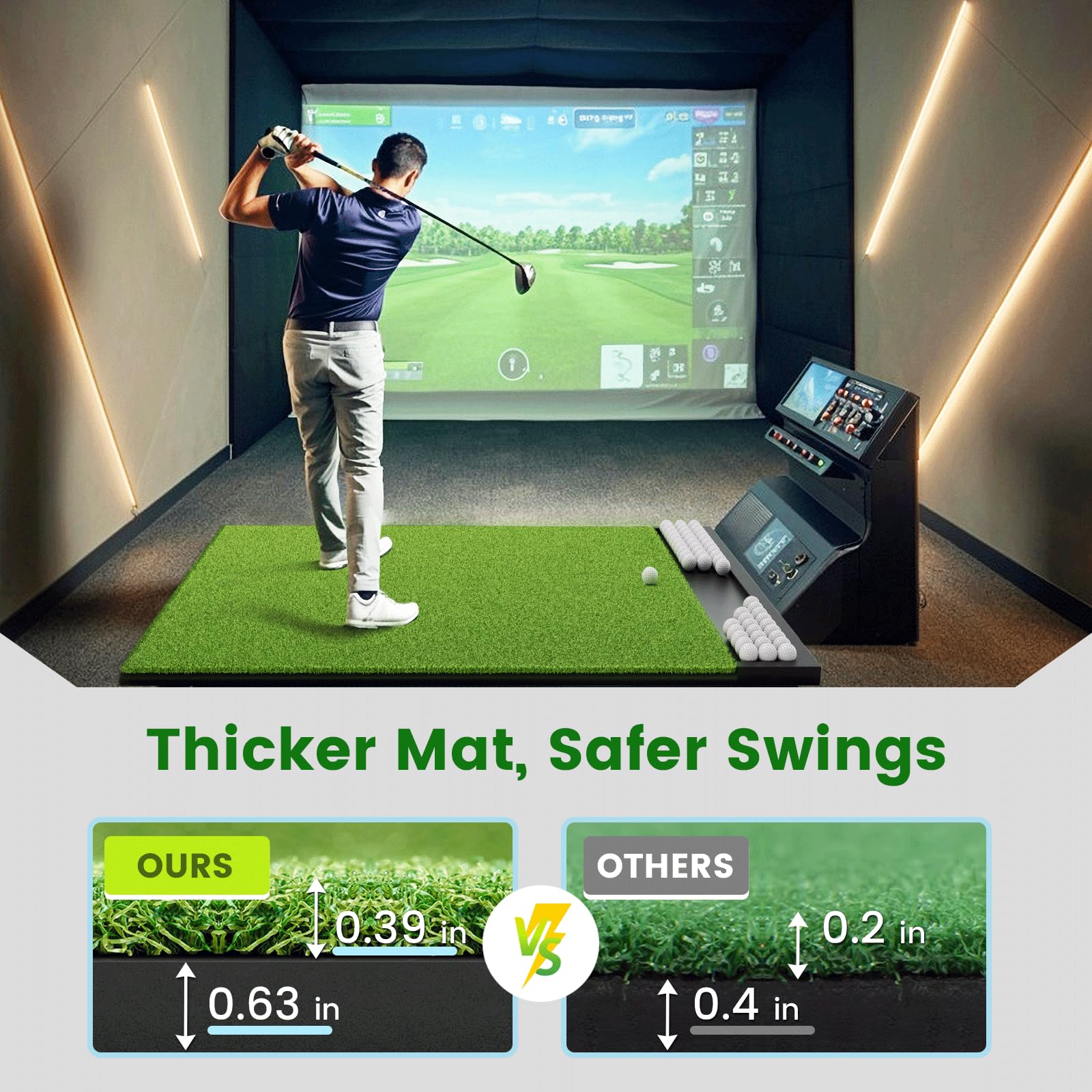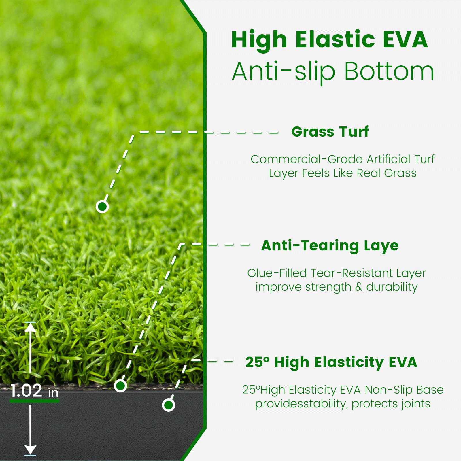 Comfort & Cushioning – Features a 0.39inch EVA foam base and 0.63inch dense turf for excellent cushioning and reduced joint strain during long practice sessions. The non-slip foam adds stability, offering a more realistic and comfortable golf experience.