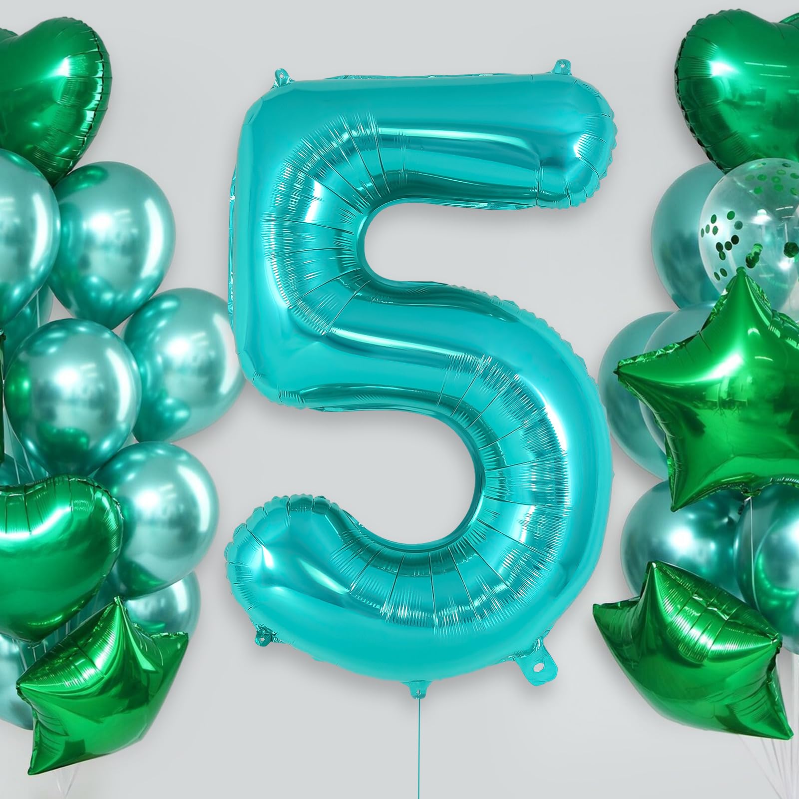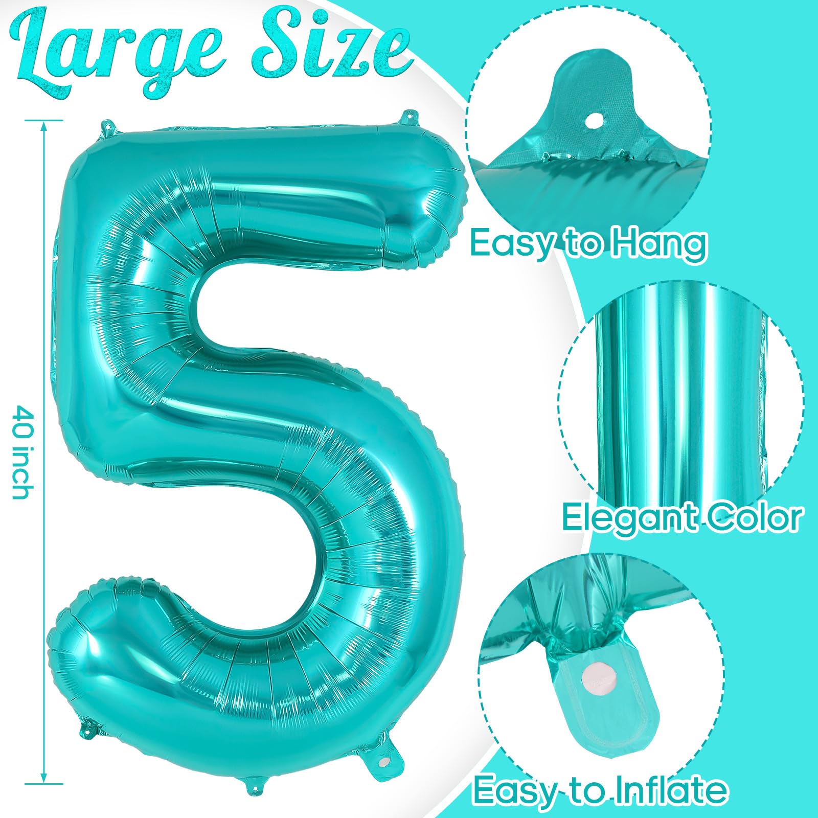 PACKAGE CONTAINS: 1 piece of teal number 5 balloon, measures around 40 inch long. The balloon has 2 loops on top and 2 on the bottom. Pretty color and giant size makes it really eye-catching.