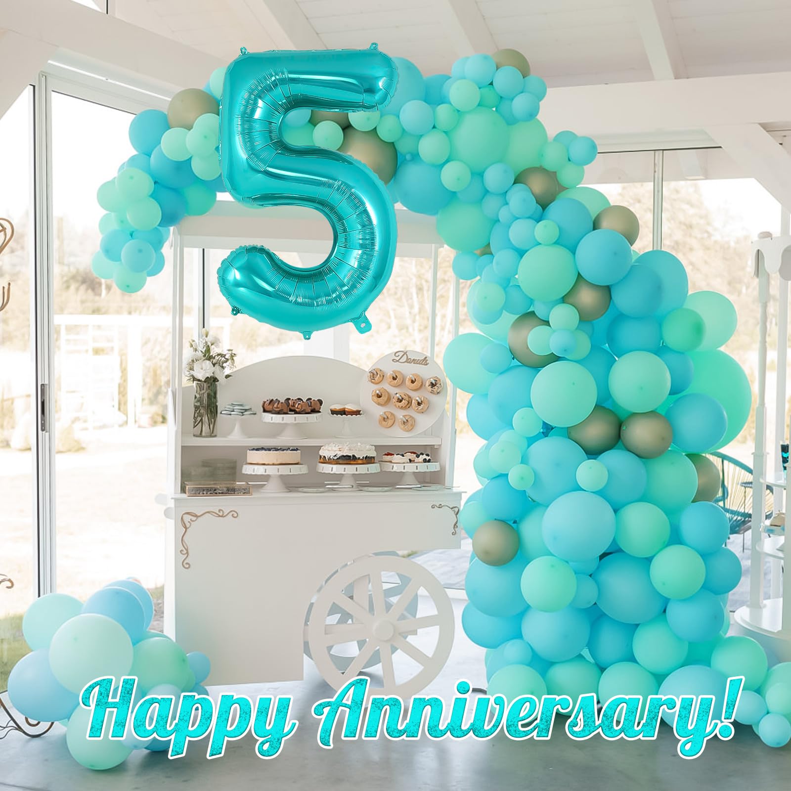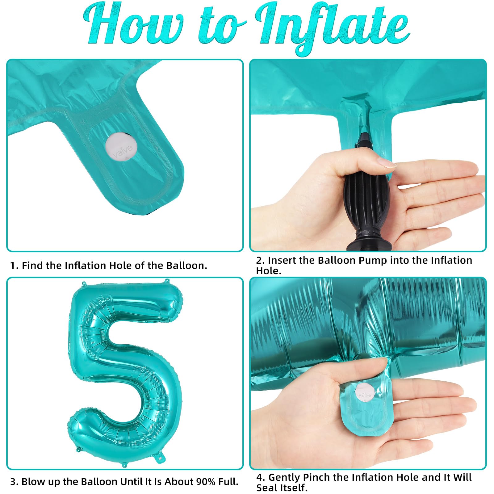 EASY TO USE: Inflate the balloon with air or helium by a balloon pump; pinch the inflation valve gently; then a big beautiful teal 5 balloon is there for you. So easy to do it!