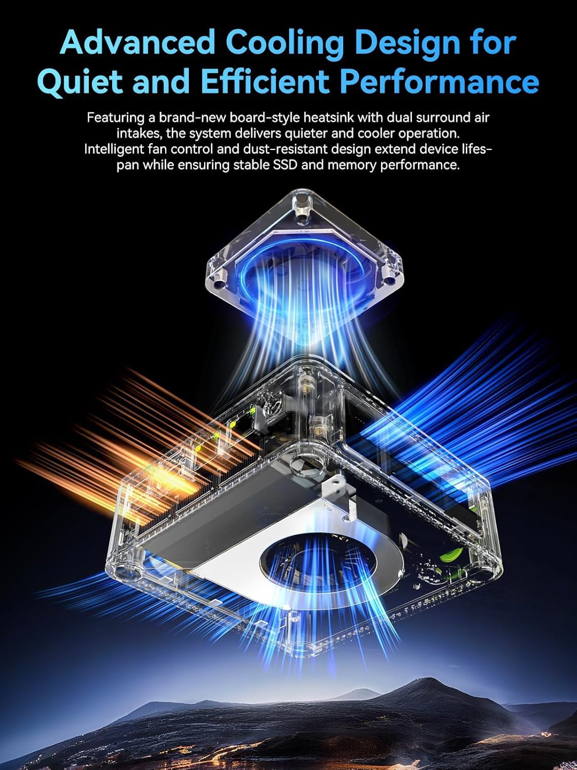 32GB DDR4 RAM & 1TB PCIe SSD - Installed with DDR4 32GB RAM Dual Channel (2x16GB), the Nucbox M5 Ultra mini pc support expansion to 64GB RAM. Featured with 1TB M.2 2280 PCIe 3.0 SSD, support dual slot expansion each can be up to 8TB SSD. (Upgrades not included)