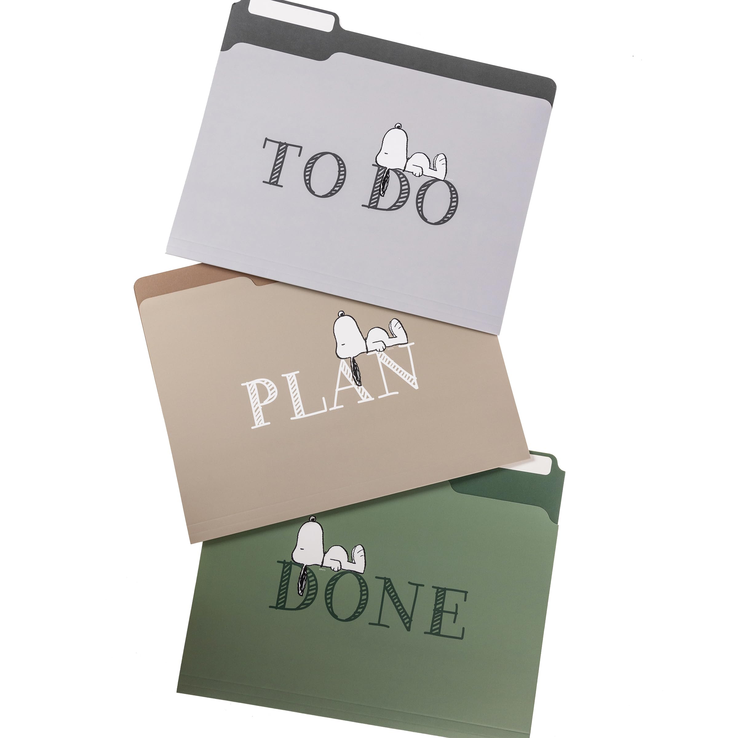 ORGANIZE IN STYLE Say goodbye to boring manila folders by accessorizing your desk with this playful set of Snoopy files. He may be sleeping on the job but you aren’t! These cute folders come in an assortment of colors and phrases. Decorative office supplies make fantastic gifts for friends, family, and co-workers.