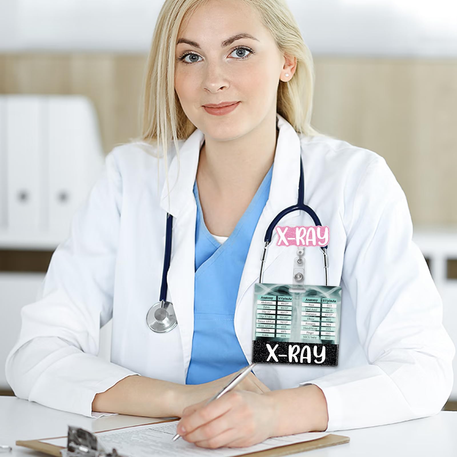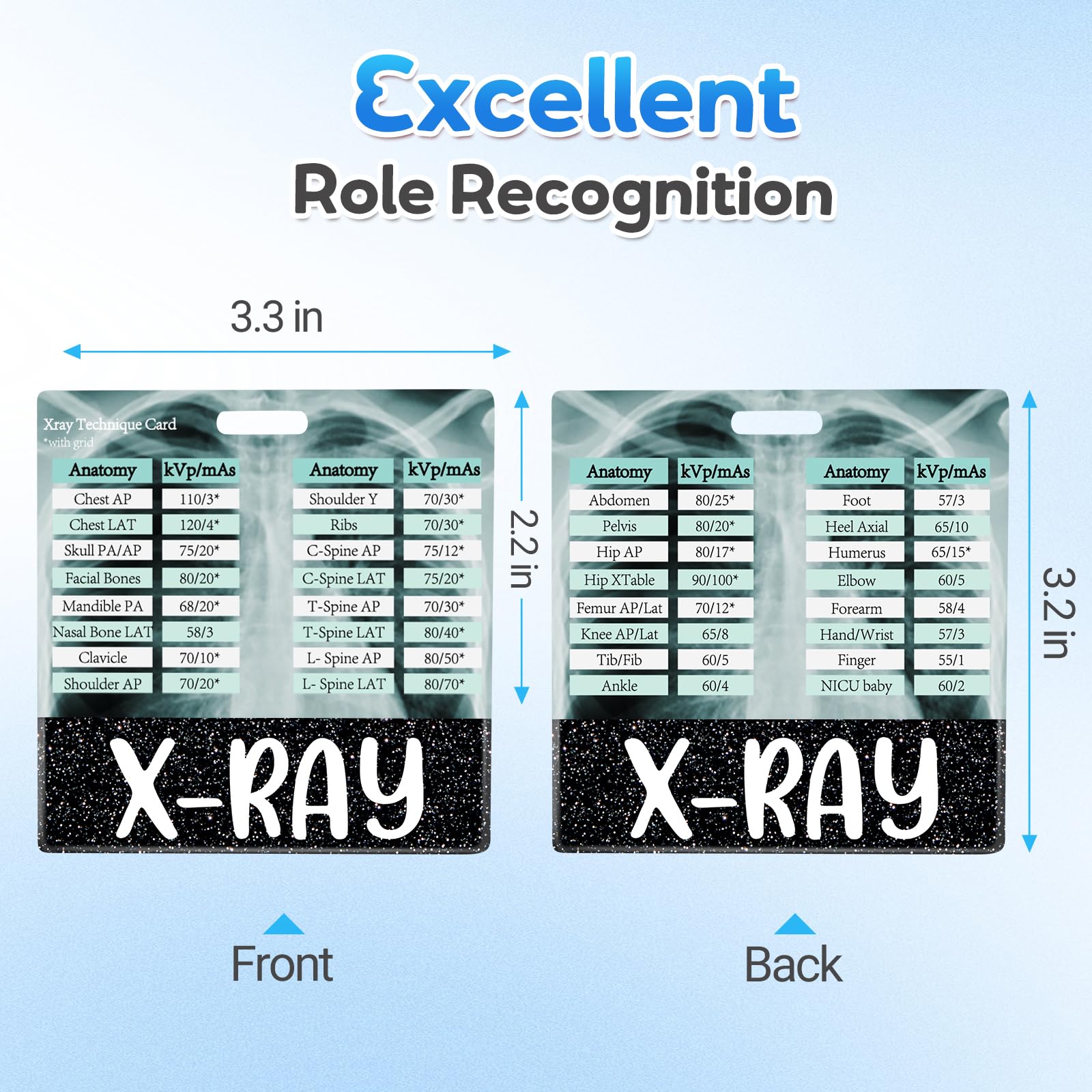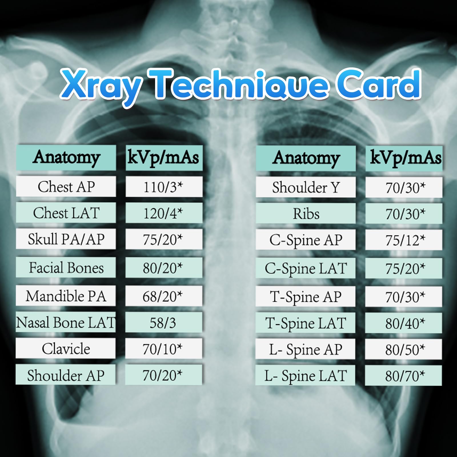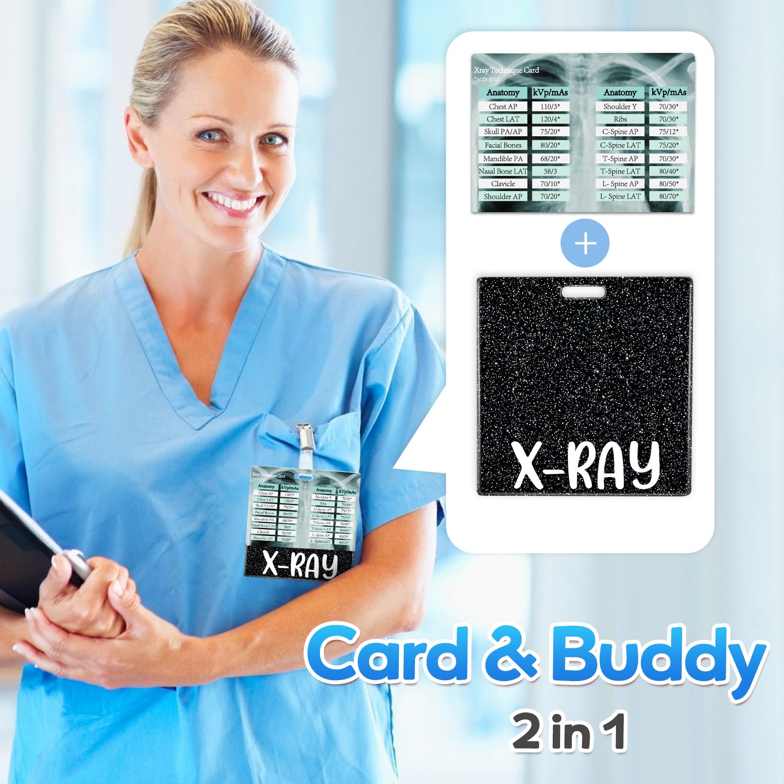 Cheat Sheet with Badge Buddy 2-in-1: It helps new radiology technicians learn the appropriate kVp settings for different body parts more quickly and effectively. Seasoned professionals can also use it as a refresher or to stay updated on the latest recommended values.