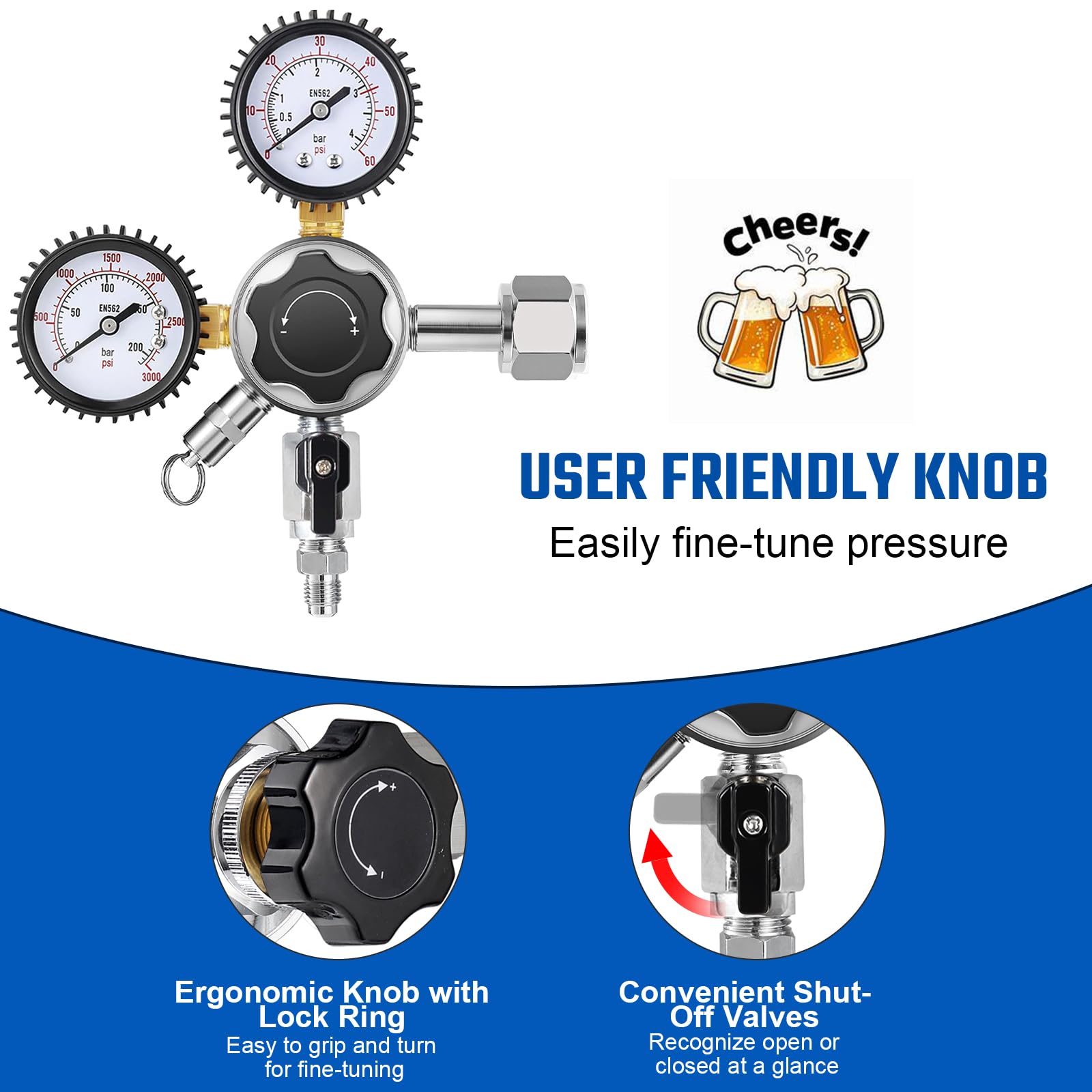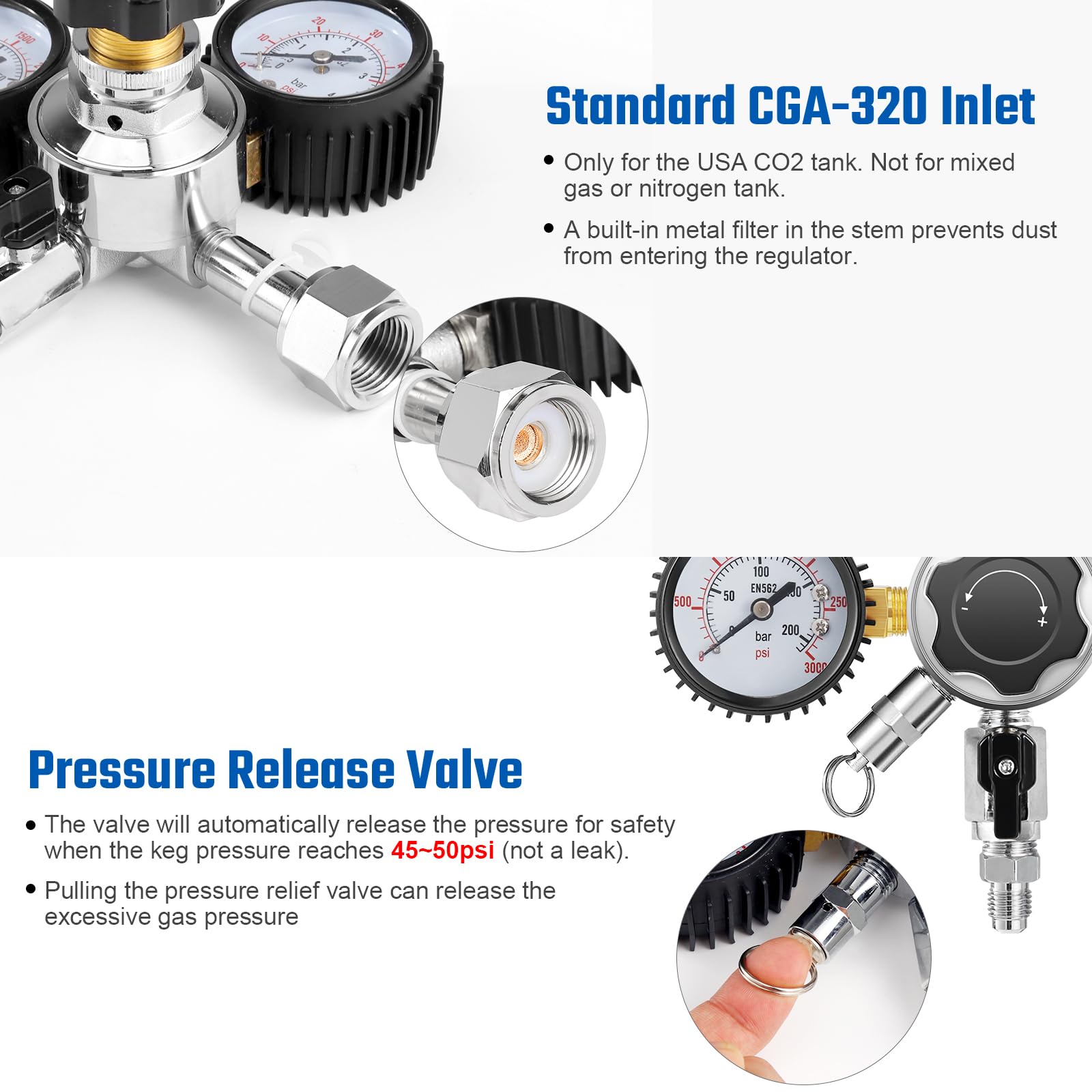 [Easy-to-Adjust Knob & Safety Relief Valve] Knurled adjustment knobs of the beer keg regulators are easy to grip and turn for precise fine-tuning CO2 levels from 0-50psi. The shut-off valve of the co2 regulator can be closed only by turning 90°, no need to turn multiple turns. The pressure relief valve will automatically release the keg pressure at around 50psi pressure for safety (not a leak).