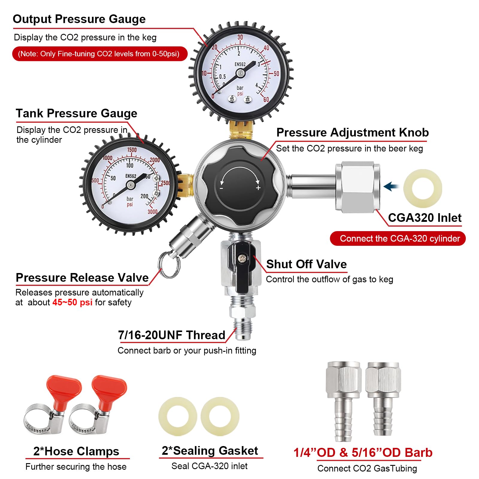 [Solid Constructions&No Leak] Heavy-duty chrome-plated brass construction would last for years with no rust. The beer keg regulator is supplied with sealing washers. Pacing a washer between the CGA-320 inlet and the tank ensures a tight seal, no CO2 leak!