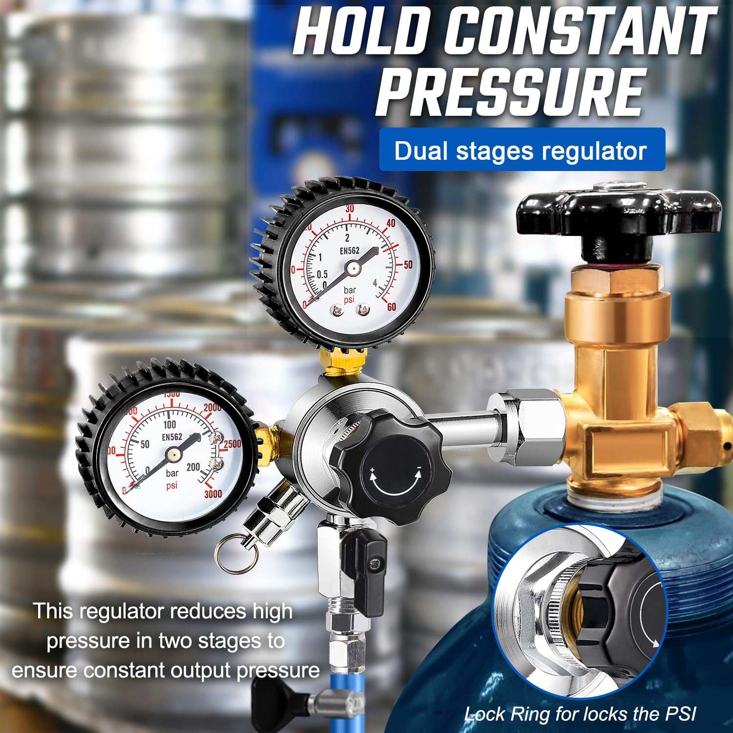 [Precise and Clear Gauges] The top gauge(0-60psi) of kegerator regulator has an appropriate scale range to allow for precise fine-tuning of keg pressure. The left gauge (0-3000psi) is convenient for monitoring the amount of CO2 in the tank at any time. The shockproof case can protect the CO2 regulator gauges, making the gauges more durable.