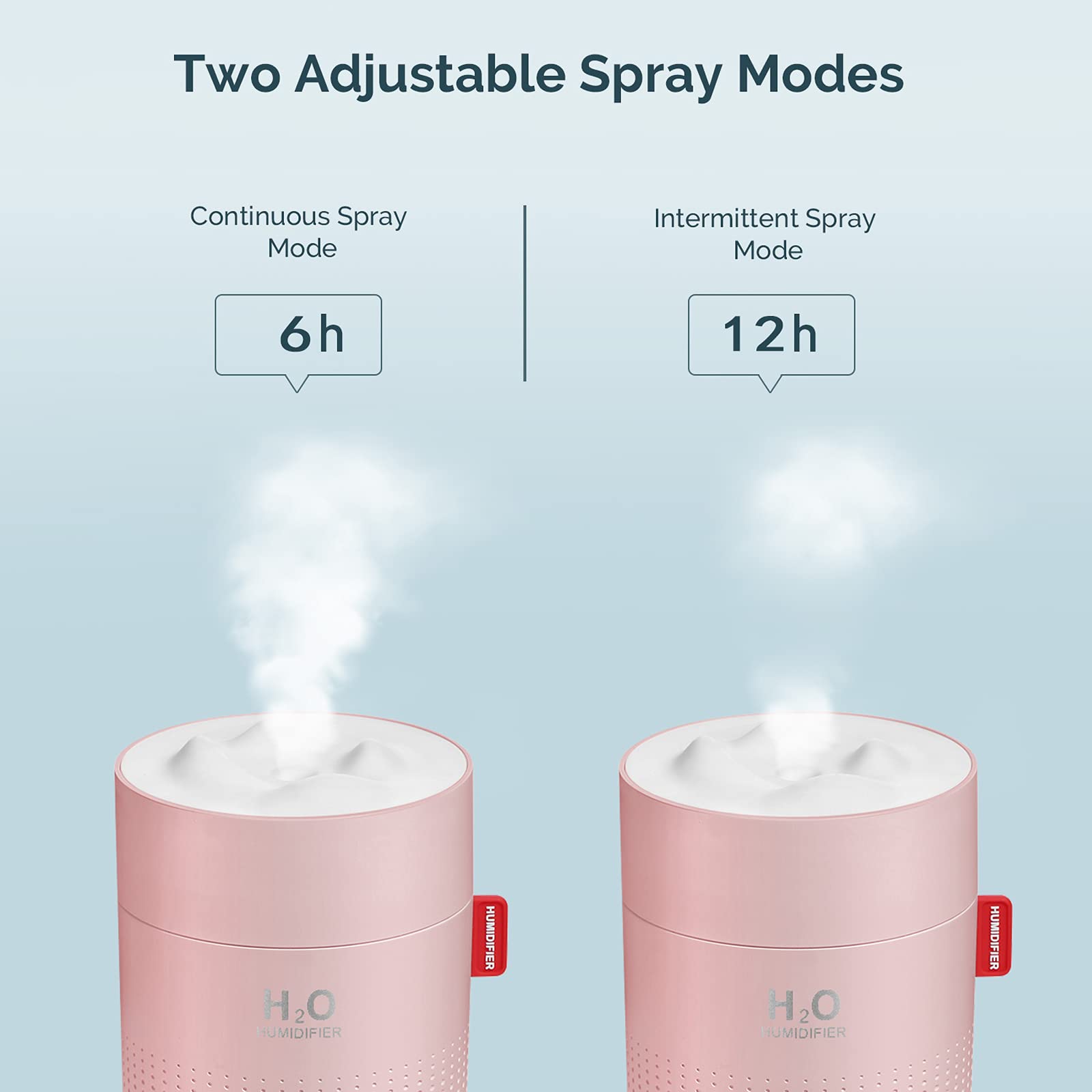 【TWO MIST MODES】This mini humidifier has two modes. When you press the button first time, it will continuously spray for 6 hours. When you press again and it will intermittently spray (stop 2 seconds) for 12 hours. 500ml large capacity produces longer mist.