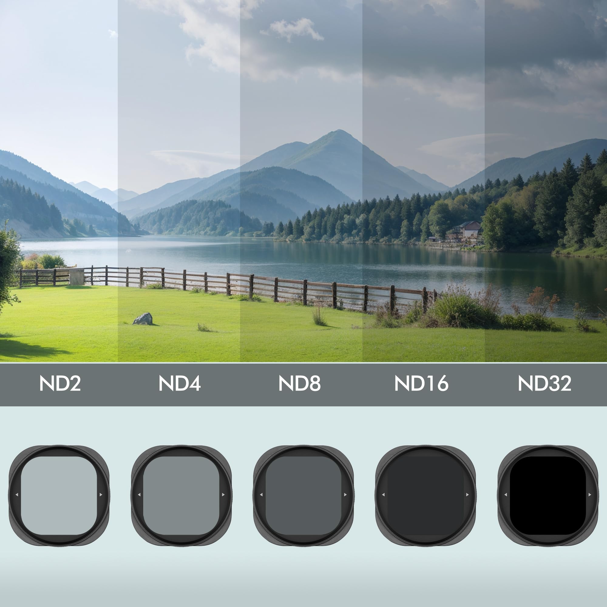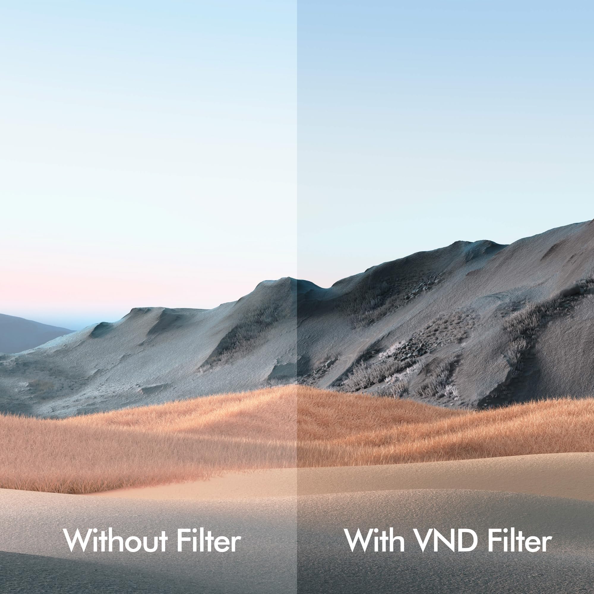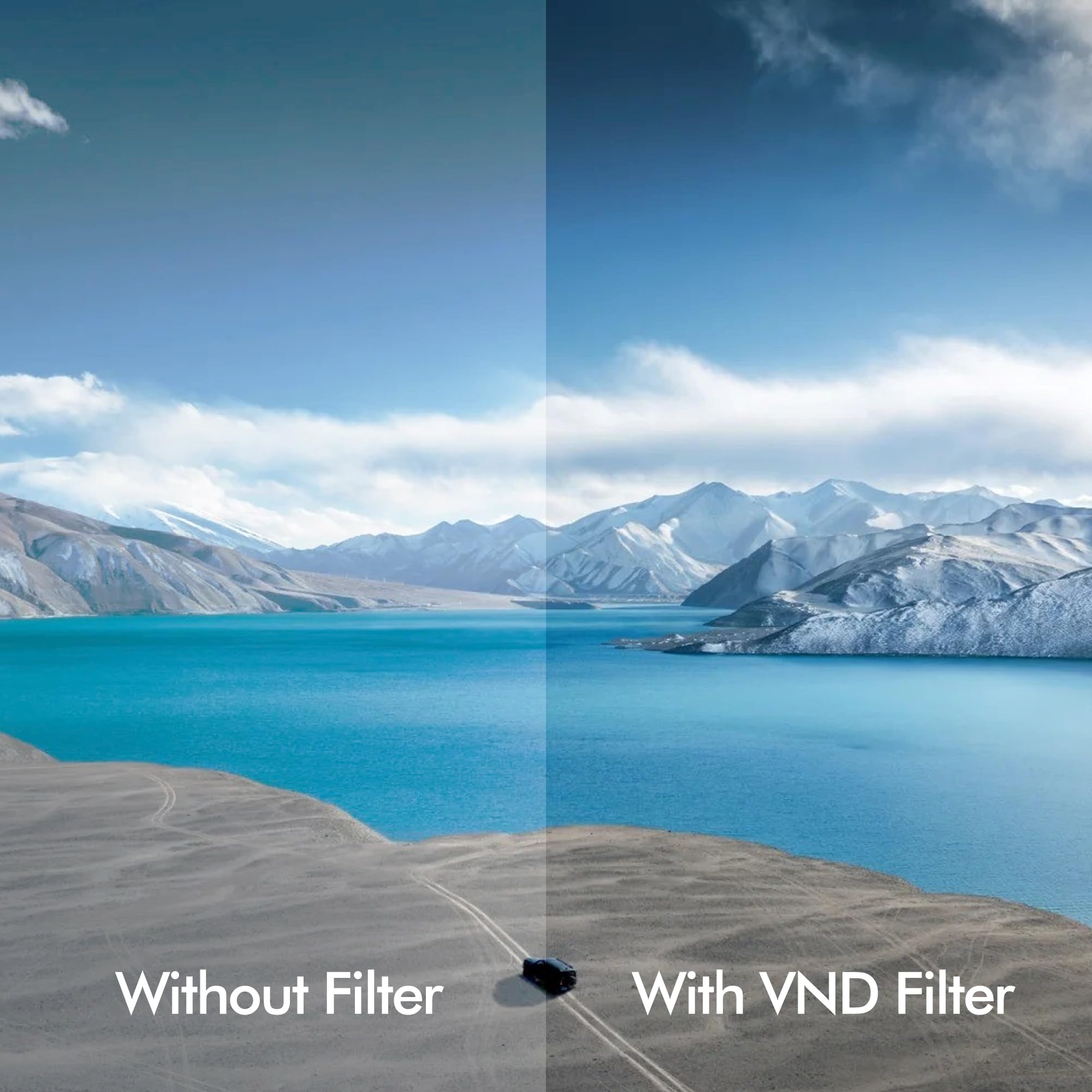 A VND (Variable Neutral Density) filter can achieve different levels of light reduction by adjusting the lens between ND2 and ND32. It can flexibly control the amount of light entering the camera without altering the image's color or contrast, making it suitable for slow-shutter photography or scenarios where a large aperture is used.