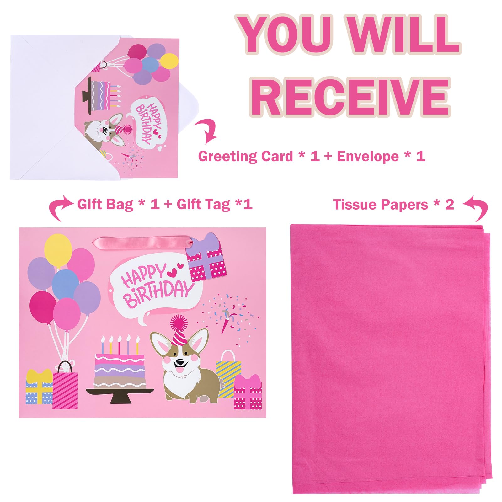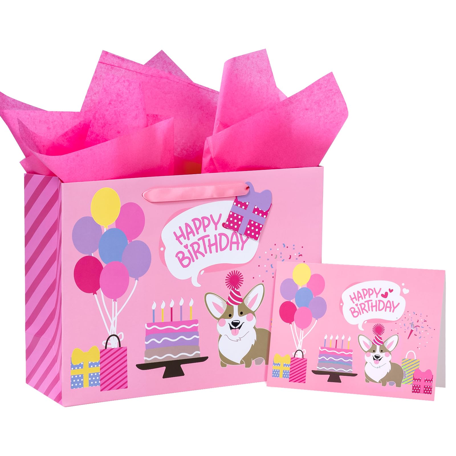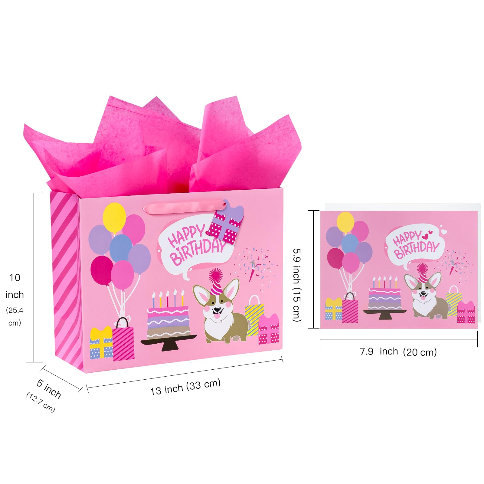 PACKAGE & SIZE: The package includes 1 gift bag + 1 greeting card + 1 gift tag + 2 tissue paper. The gift bag measure 13" Wide x 10" High x 5" Deep. The appropriate size can hold a lot of things STRONG & PREMIUM QUALITY: WRAPAHOLIC gift bags are all made with superior quality. Every part of the bag is well-made using heavy duty glue, making them sturdy and reliable for every packing need. UNIQUE LOOKING: Adorable corgi dog and "Happy Birthday" lettering are printed. Its stylish design is guaranteed to make your merchandise and gifts stand out from the crowd. SUPER CONVENIENT:It is convenient to use with handle design. The gift bag is perfect for craft and DIY, you can decorate it with beautiful ribbons. This is very convenient and beautiful to use these bags to hold gifts Our excellent gift bags perfect for birthday gift bag, party favor bag, celebration gift bag. QUALITY CUSTOMER SERVICE: Any question about products or orders, please feel free to contact the customer service, we will try our best to solve the problem.