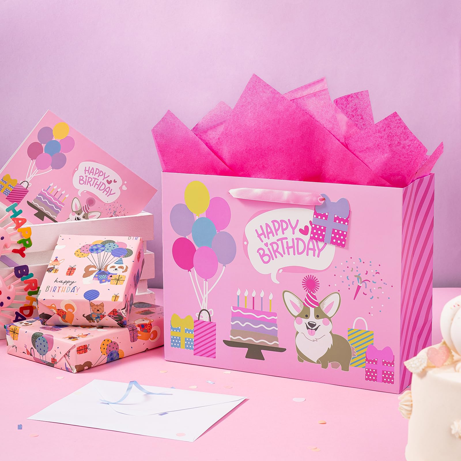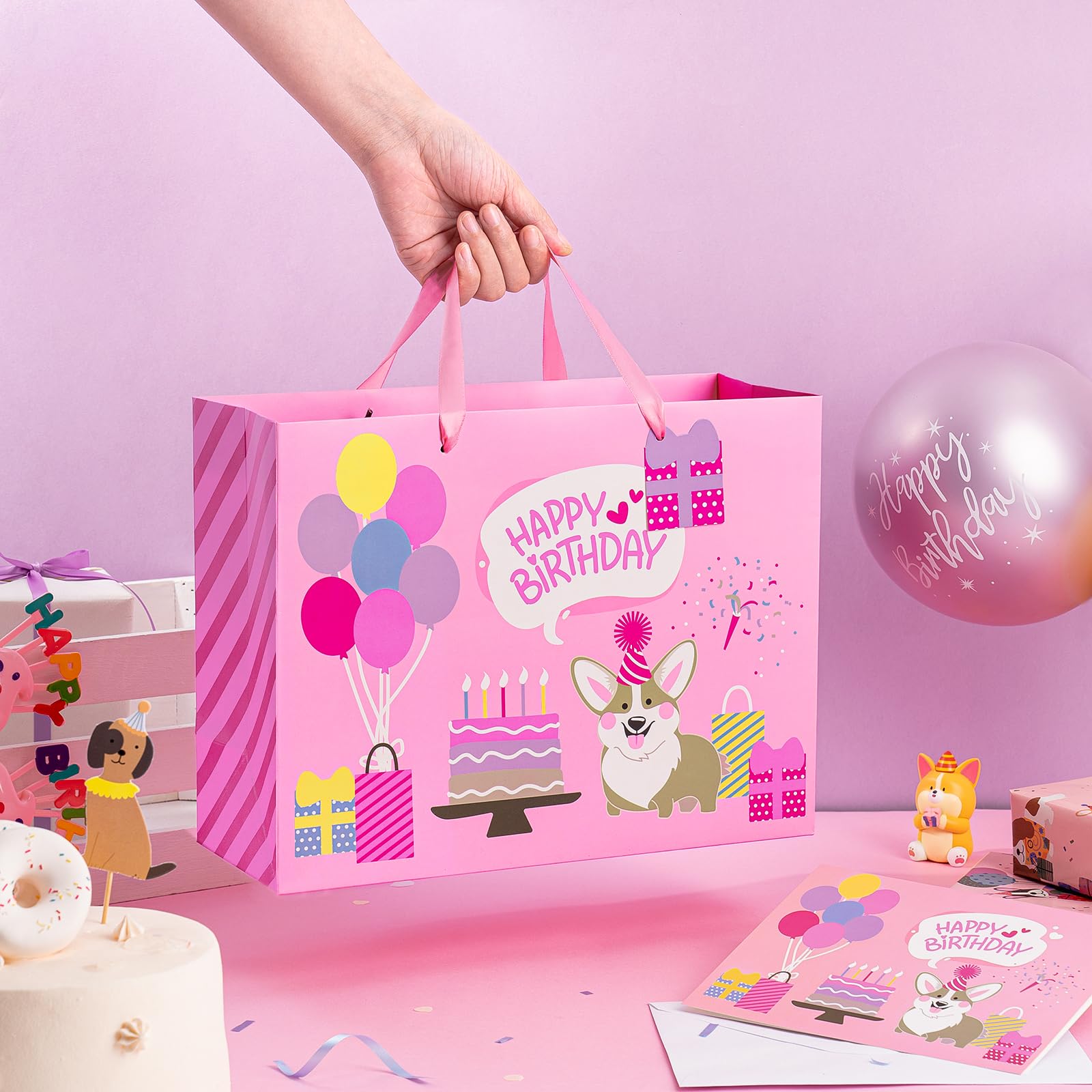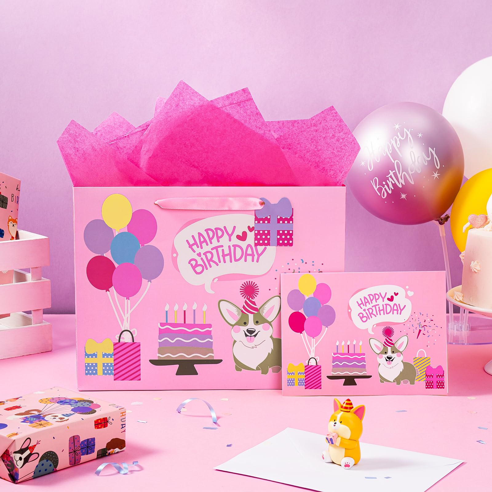 PACKAGE & SIZE: The package includes 1 gift bag + 1 greeting card + 1 gift tag + 2 tissue paper. The gift bag measure 13" Wide x 10" High x 5" Deep. The appropriate size can hold a lot of things STRONG & PREMIUM QUALITY: WRAPAHOLIC gift bags are all made with superior quality. Every part of the bag is well-made using heavy duty glue, making them sturdy and reliable for every packing need. UNIQUE LOOKING: Adorable corgi dog and "Happy Birthday" lettering are printed. Its stylish design is guaranteed to make your merchandise and gifts stand out from the crowd. SUPER CONVENIENT:It is convenient to use with handle design. The gift bag is perfect for craft and DIY, you can decorate it with beautiful ribbons. This is very convenient and beautiful to use these bags to hold gifts Our excellent gift bags perfect for birthday gift bag, party favor bag, celebration gift bag. QUALITY CUSTOMER SERVICE: Any question about products or orders, please feel free to contact the customer service, we will try our best to solve the problem.