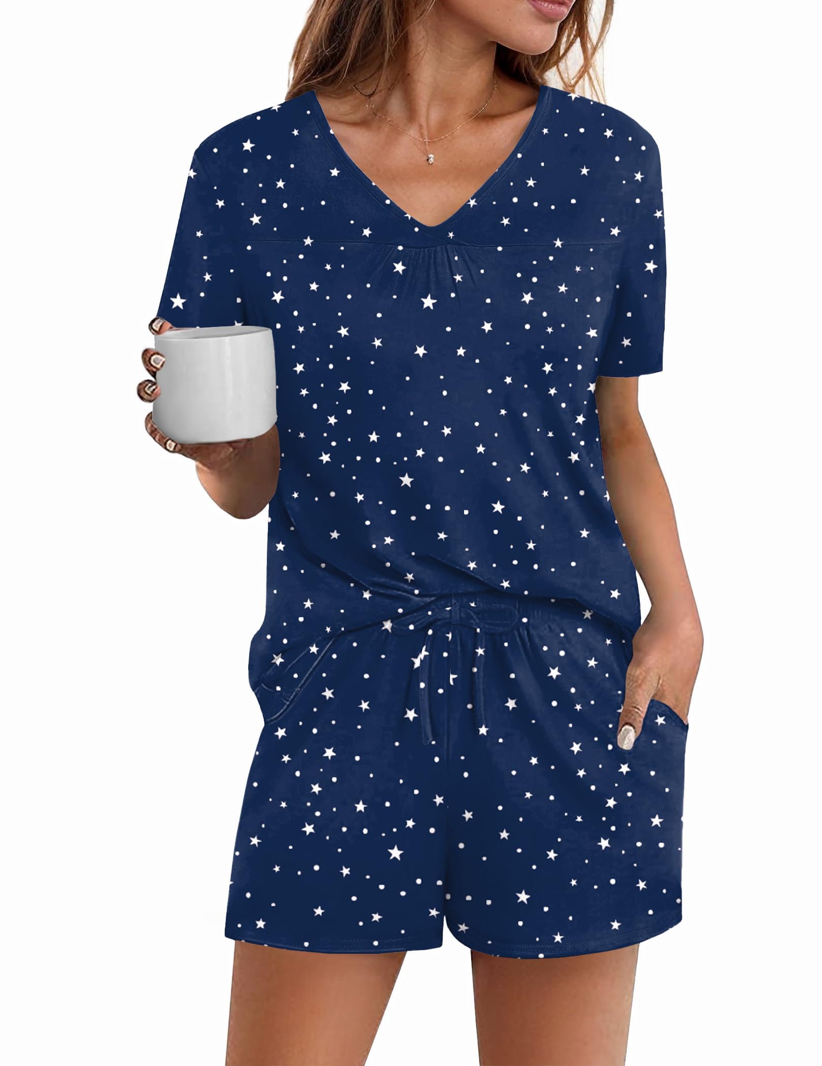 This soft pajama top features V neck, short sleeve, pleated front neckline,and the comfy modal pajama shorts is designed with elastic waist, drawstring and thigh-length